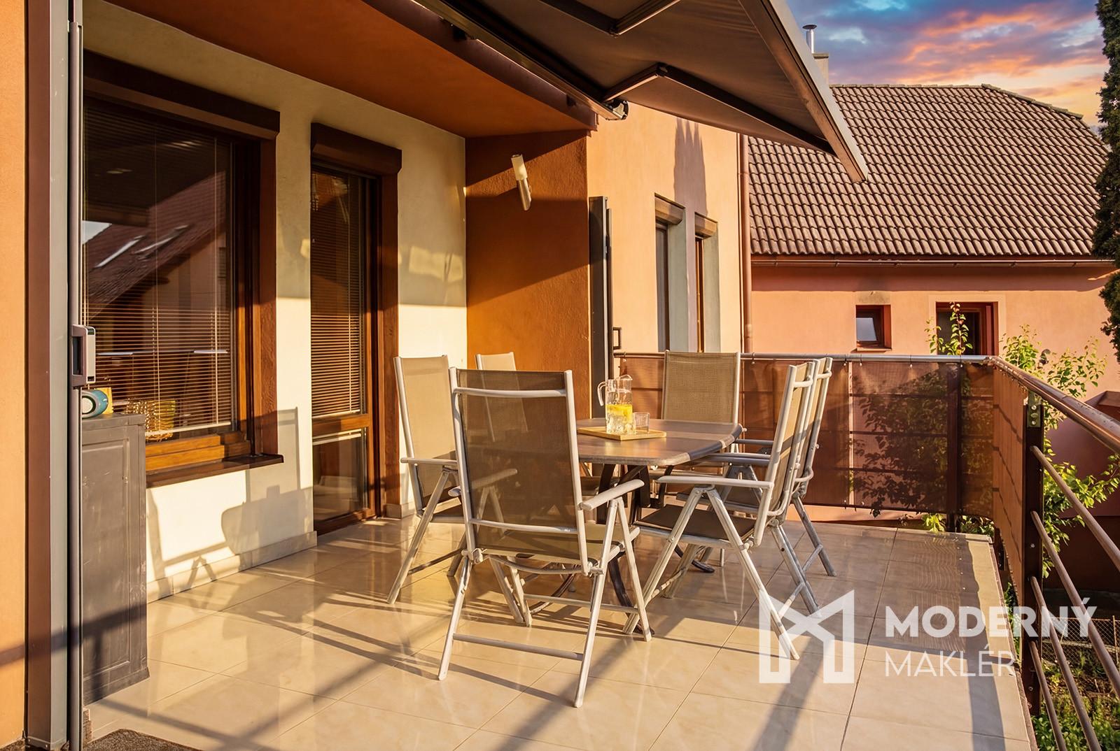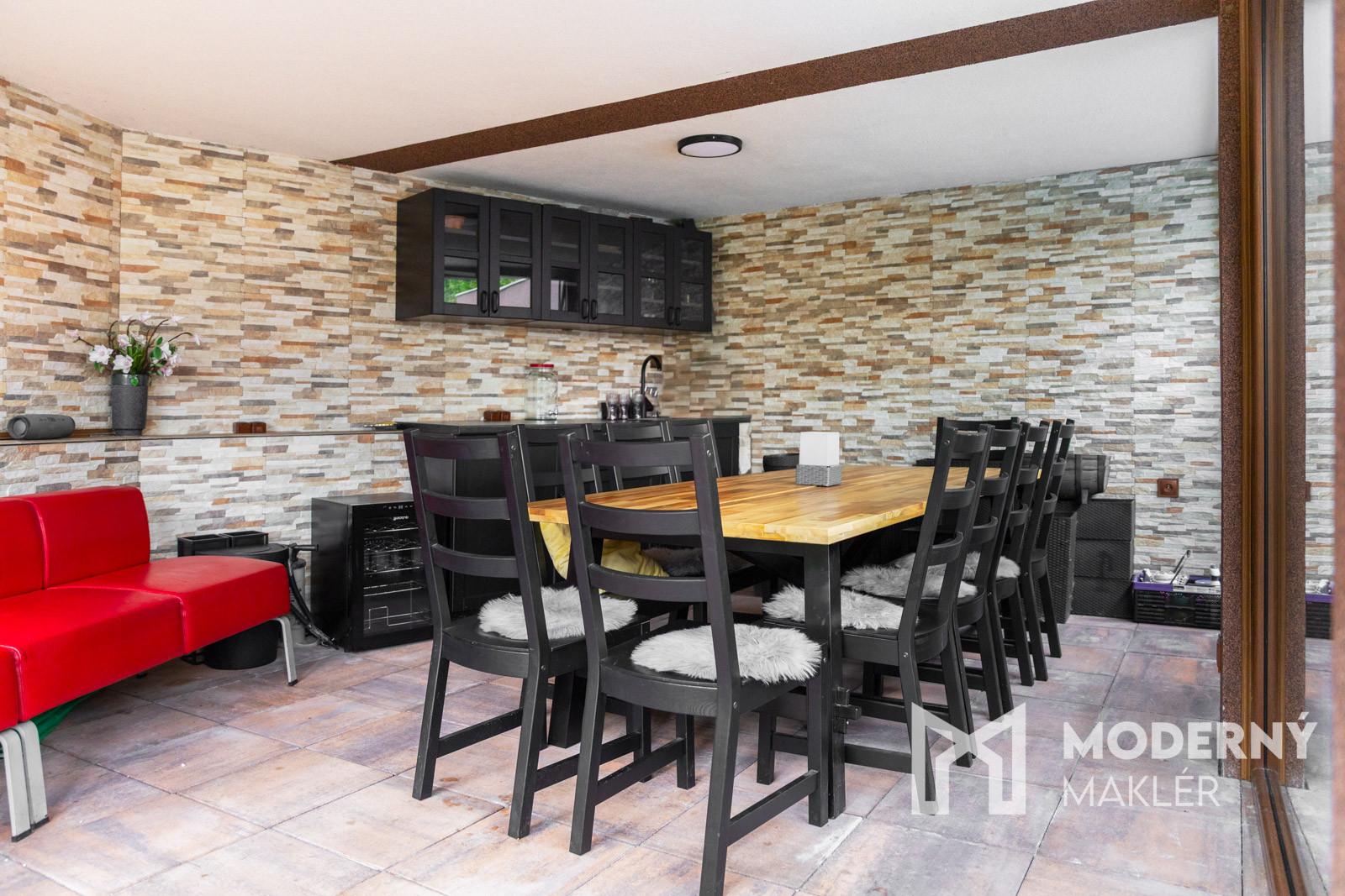 Na slnečnom pozekmu sa nachádza záhrada, letná kuchyňa s grilom a ďalším posedením a garáž