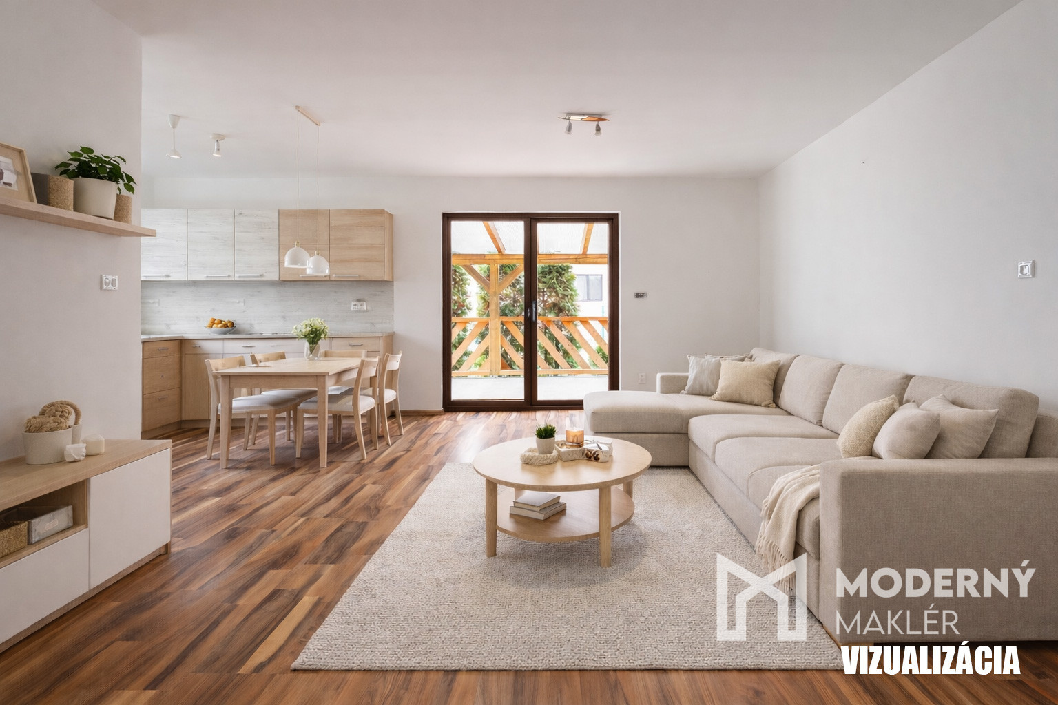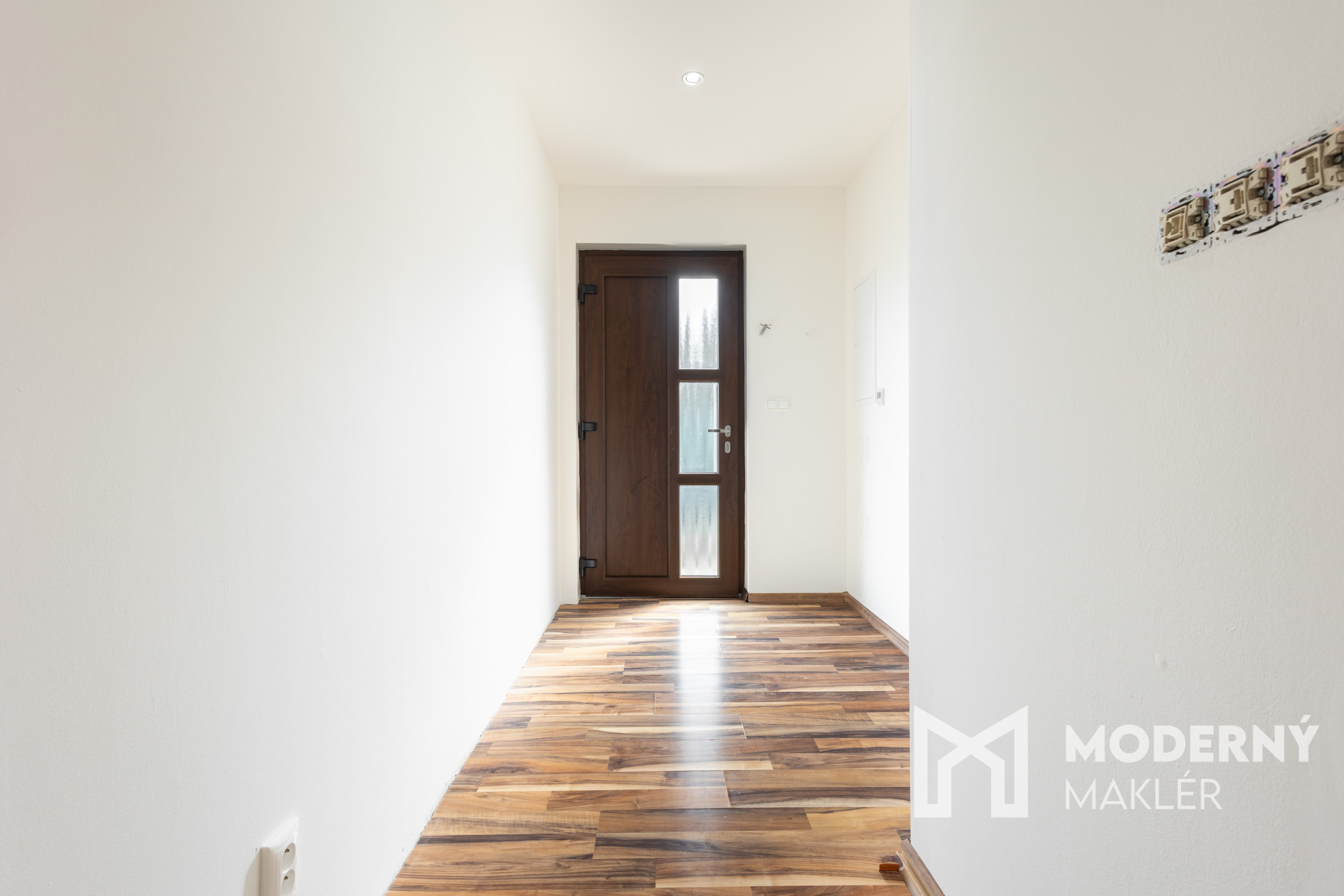 Dom sa skladá zo vstupnej chodby, ďalej sa tu nachádza veľký obývací priestor spojený s kuchyňou, ktorý vytvára príjemné a funkčné bývanie pre celú rodinu. K dispozícii je praktická špajza pre dodatočné úložné priestory. Dom disponuje kompletne vybavenou kúpeľňou a samostatnou toaletou pre väčšie pohodlie obyvateľov. Súčasťou nehnuteľnosti sú tri samostatné nepriechodné izby, ktoré poskytujú dostatok súkromia a flexibility pri využití priestorov. Dom má priamy prístup na dve terasy - prvú s rozlohou 20 m² a druhú s rozlohou 25 m², ktoré rozširujú obytný priestor a umožňujú vychutnávanie si vonkajších aktivít a relaxu.