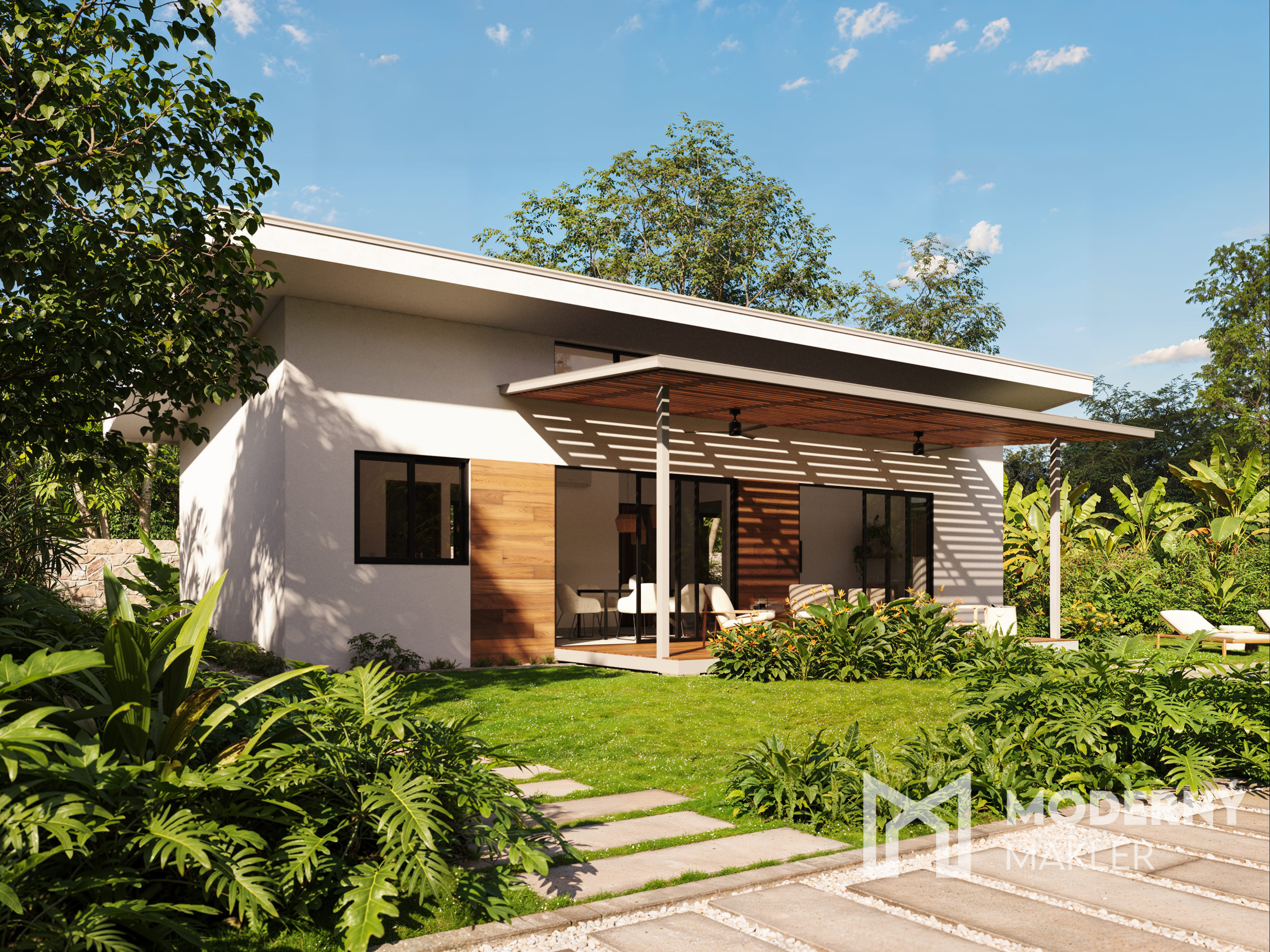 Vila sa skladá z dvoch hlavných zón - spoločenskej a oddychovej časti. Cez otvorený priechod sa priamo dostanete do veľkorysej obývačky s kuchyňou, pričom tento istý priechod vám umožní prístup do oboch spální. Každá spálňa má svoje vlastné sociálne zázemie. Celý priestor je vďaka veľkým oknám dokonale presvetlený a poskytuje neskutočné výhľady na okolitú prírodu. Vila kombinuje tropickú atmosféru, veľkorysosť priestorov a funkčnosť v dokonalo vyváženom celku. Orientácia nehnuteľnosti bude navrhnutá tak, aby maximálne využila možnosti konkrétneho pozemku - naši architekti na Kostarike vyberú pre vašu vilu tú najvhodnejšiu orientáciu.