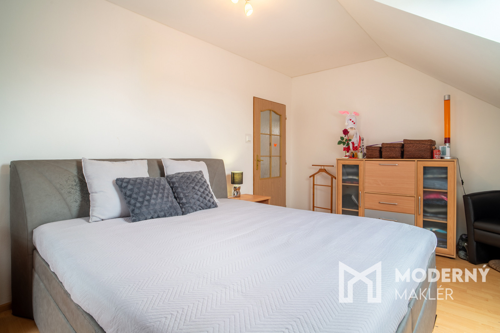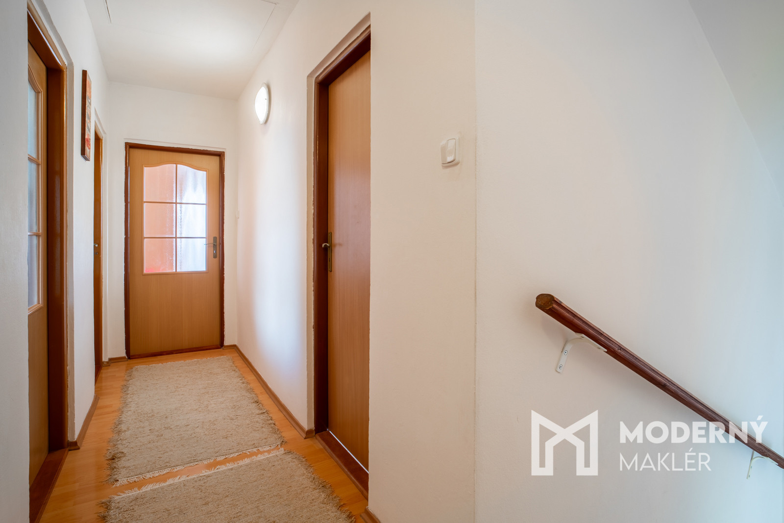 Na poschodí sa nachádza kúpeľňa a tri izby – dve za kúpeľňou a jedna na ľavej strane od schodiska. Podkrovie s rozlohou 30 m² je možné zobytnit. Celkovo dom ponúka štyri izby, dve kúpeľne, technickú miestnosť, priestrannú obývačku s kuchyňou a praktickú loggiu pri vstupe.