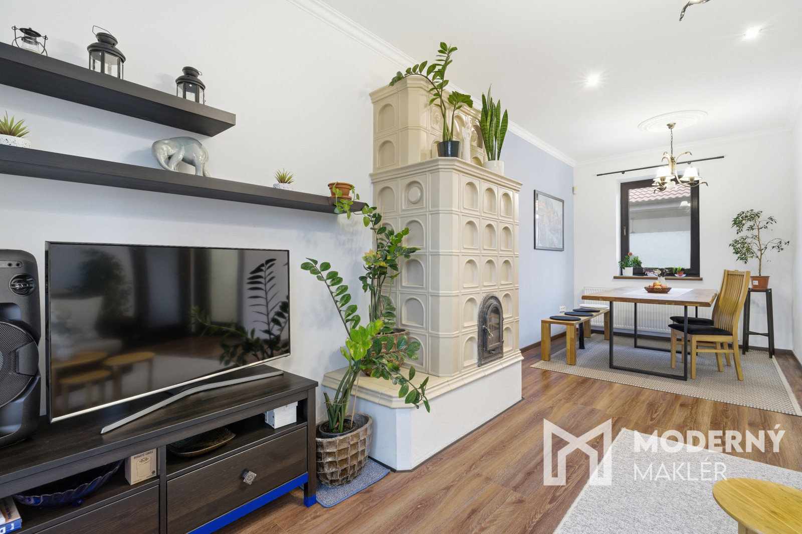 Interiér je ladený v príjemnom nadčasovom štýle s kvalitnými interiérovými dverami a zárubňami. V obytných miestnostiach sa nachádzajú parkety, samozrejmosťou sú kvalitné eurookná s esteticky zladenými parapetmi. Celkový dojem dotvárajú čisté stierky, maľovka a vkusne zvolené svietidlá. Dominantou obývacej časti sú štýlové kachle, ktoré vytvárajú jedinečnú atmosféru a zároveň slúžia ako plnohodnotný doplnkový zdroj vykurovania počas zimných mesiacov. O tepelný komfort sa stará výkonný kotol značky Buderus riadený centrálnym termostatom. Nehnuteľnosť je vybavená alarmom a videovrátnikom, čo zvyšuje bezpečnosť bývania.