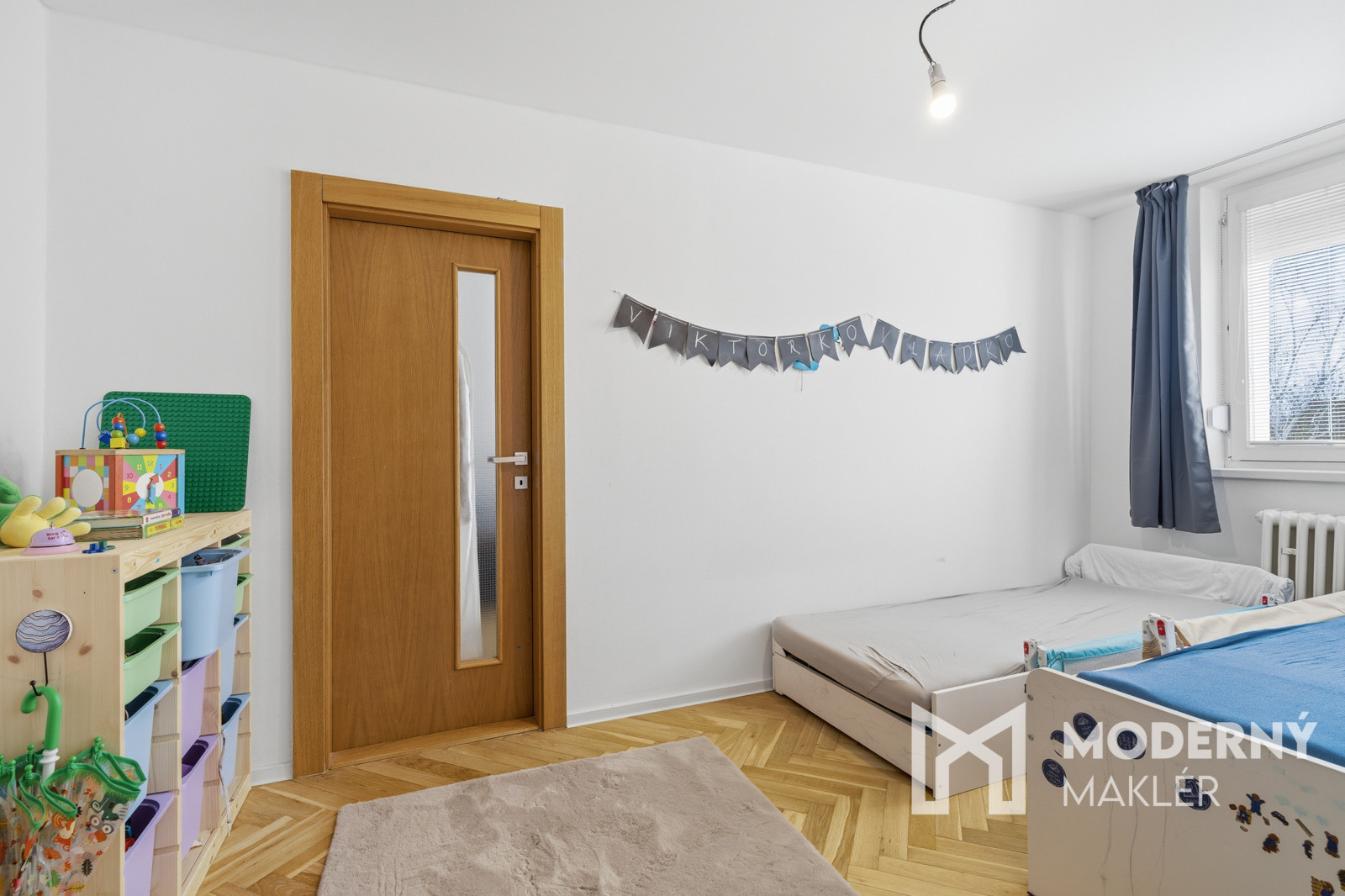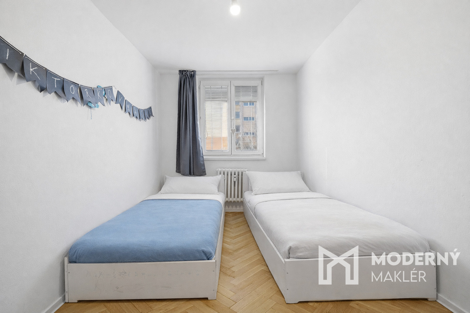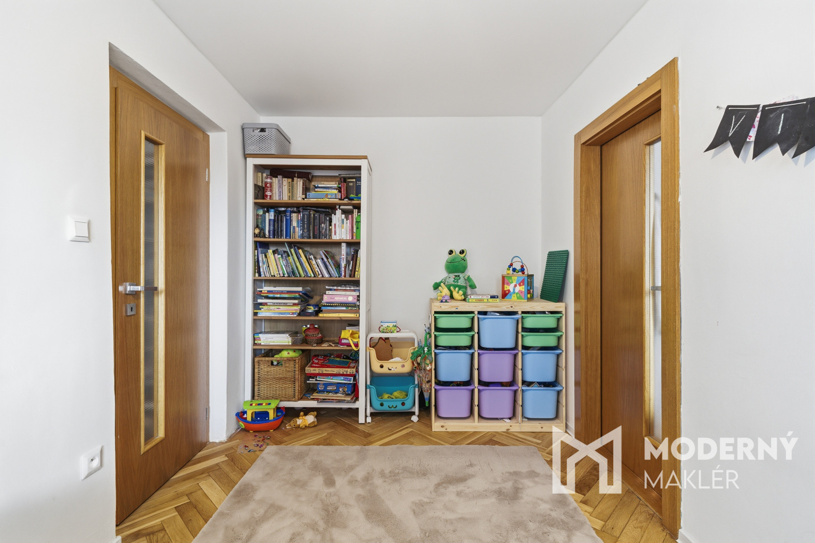 Byt pozostáva zo vstupnej chodby, z ktorej sa smerom doprava nachádza priestranná kuchyňa s výstupom na balkón a priamym prepojením do obývacej izby. Na ľavej strane z chodby sa nachádzajú dve samostatné izby, kúpeľňa a samostatné WC. Súčasťou dispozície je aj ďalšia izba prístupná priamo z jednej z detských spální, ktorá je teda priechodná. Byt sa predáva kompletne zariadený – zariadenie zostáva podľa fotodokumentácie, s výnimkou manželskej postele, detských postelí a televízie.
