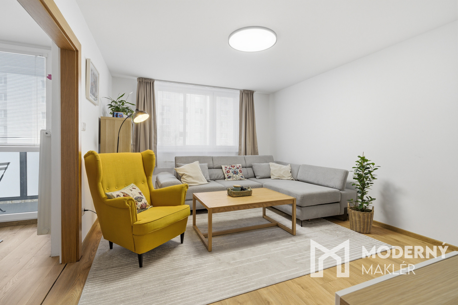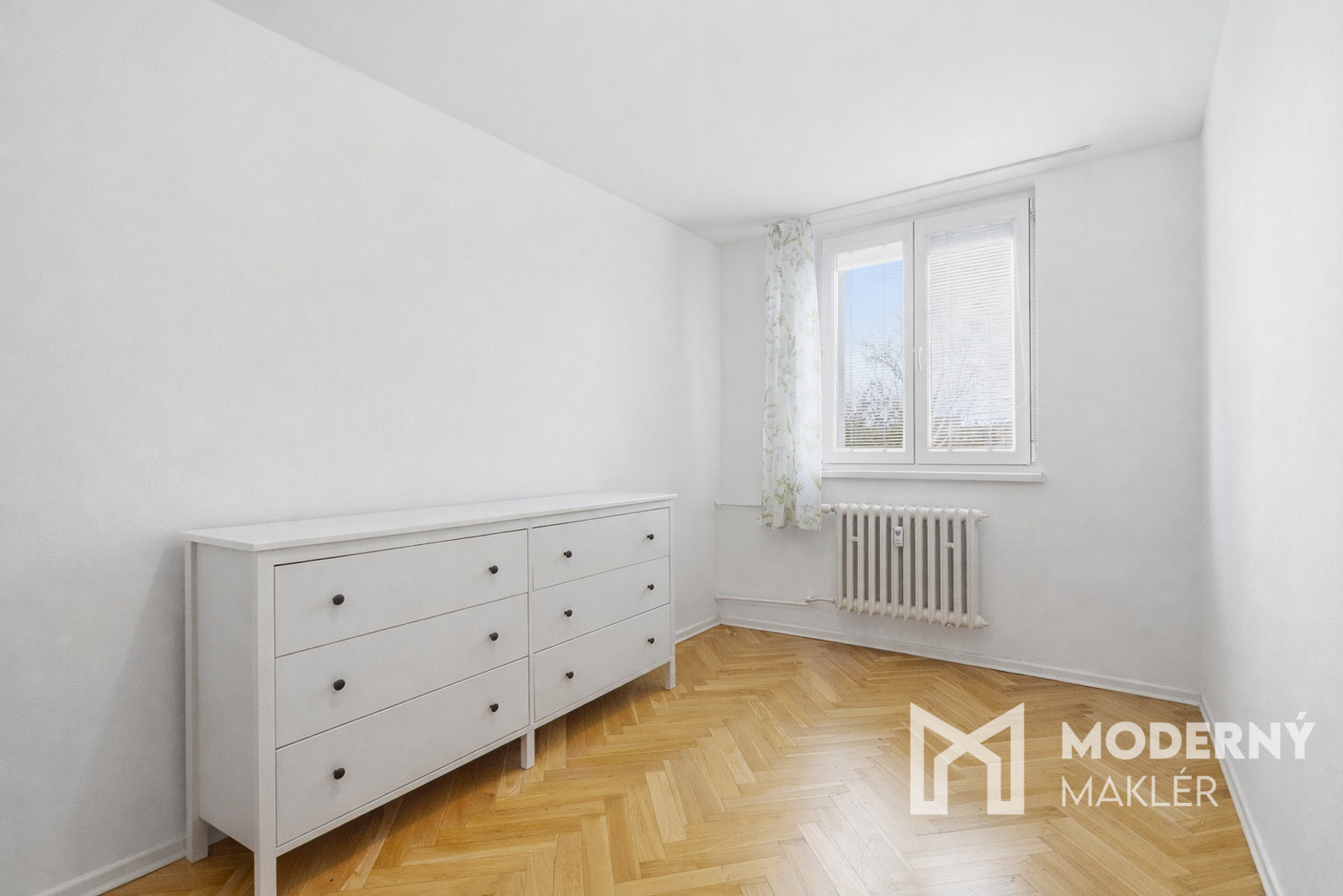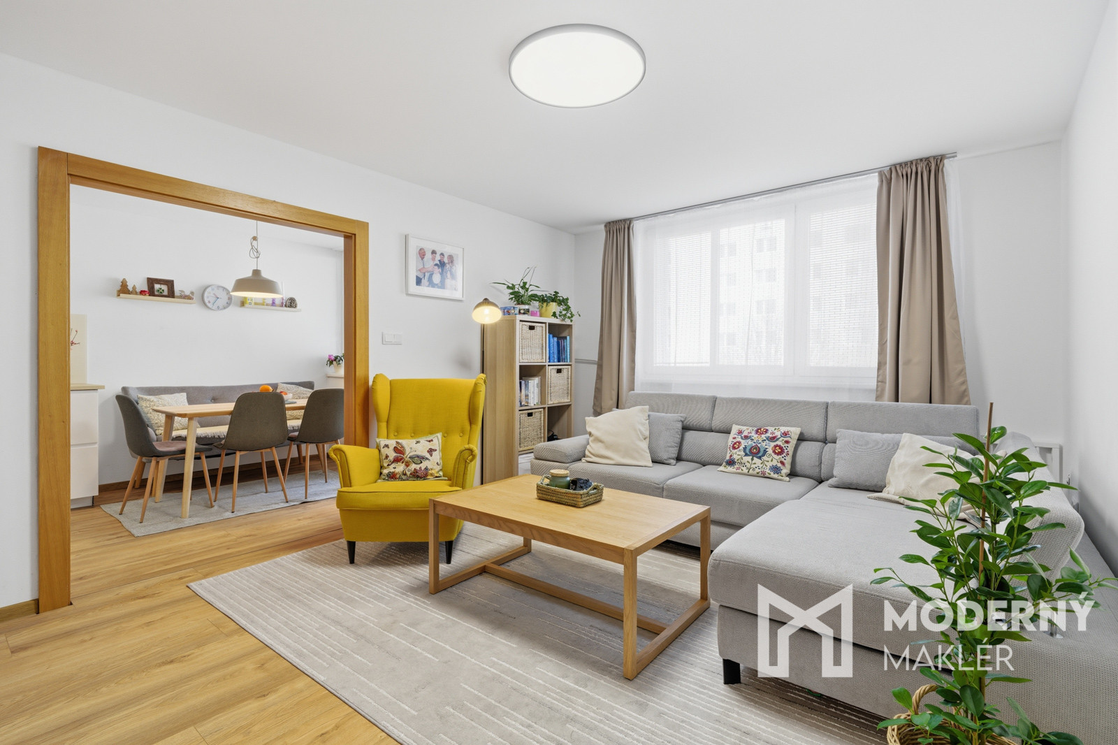 Byt pozostáva zo vstupnej chodby, z ktorej sa smerom doprava nachádza priestranná kuchyňa s výstupom na balkón a priamym prepojením do obývacej izby. Na ľavej strane z chodby sa nachádzajú dve samostatné izby, kúpeľňa a samostatné WC. Súčasťou dispozície je aj ďalšia izba prístupná priamo z jednej z detských spální, ktorá je teda priechodná. Byt sa predáva kompletne zariadený – zariadenie zostáva podľa fotodokumentácie, s výnimkou manželskej postele, detských postelí a televízie.