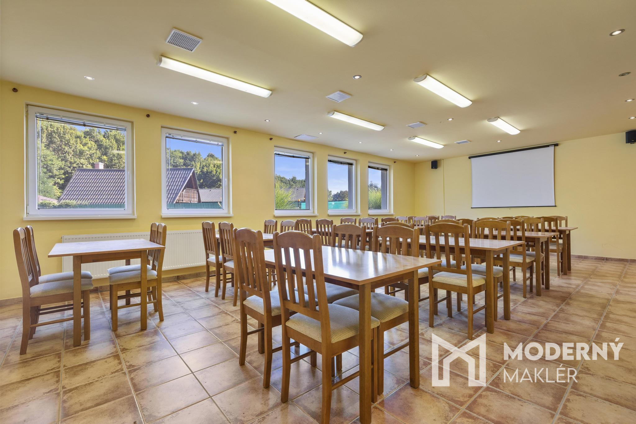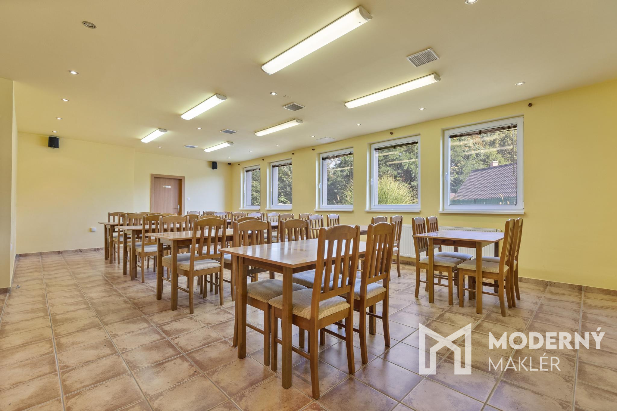 Súčasťou objektu je aj veľká spoločenská miestnosť, ktorá aktuálne slúži ako obývacia časť s jedálňou a barovým kútom. Pôvodne bola navrhnutá ako reštaurácia s barom, čo vytvára ideálny základ pre obnovenie gastronomickej prevádzky. Nehnuteľnosť ďalej disponuje plne vybavenou kuchyňou, skladom, technickou miestnosťou, kanceláriou a konferenčnou miestnosťou s kapacitou približne 50 osôb.