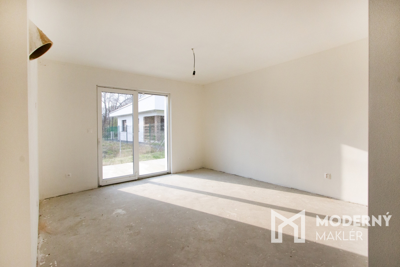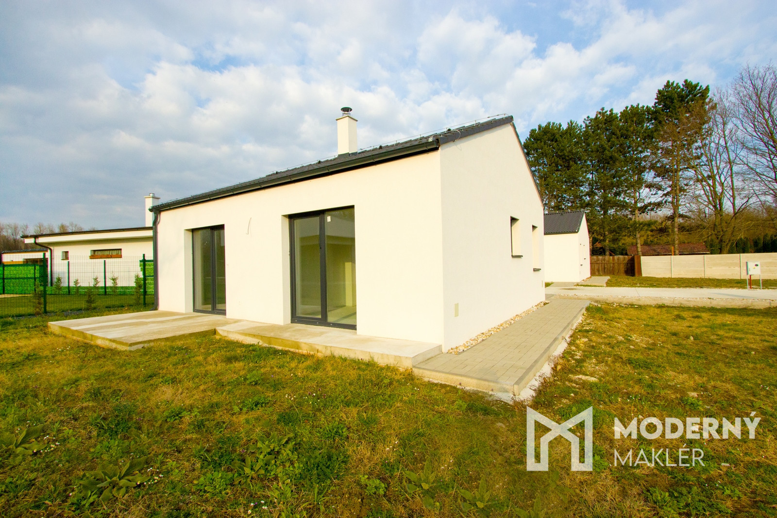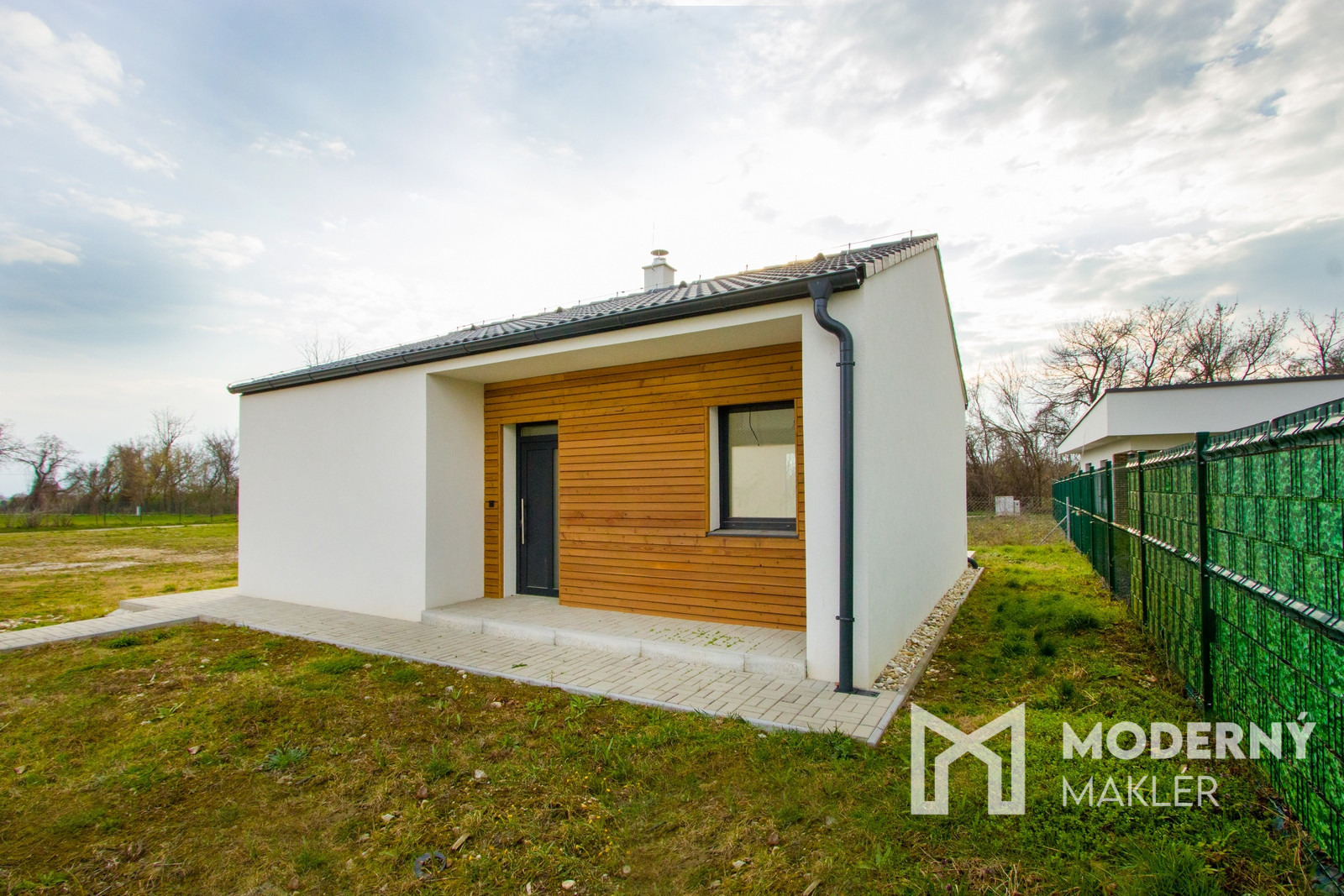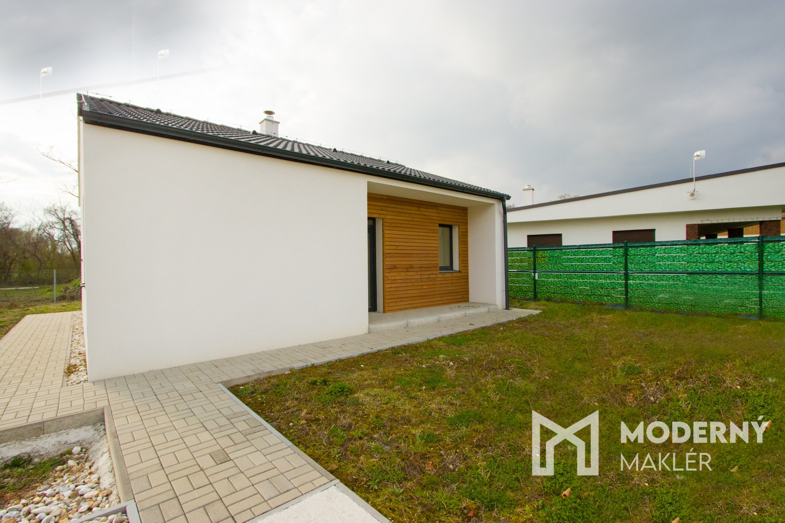 Vstup do domu zabezpečuje centrálna chodba, ktorou prechádzame do obývacej izby spojenej s kuchyňou a s výstupom na terasu, hlavnej spálne s priestorom na vstavanú skriňu, menšej spálne, ktorá je naprojektovaná ako detská izba a kúpeľne. V kuchyni je tiež komora s ohrievačom vody a orientácia terasy je na východ.