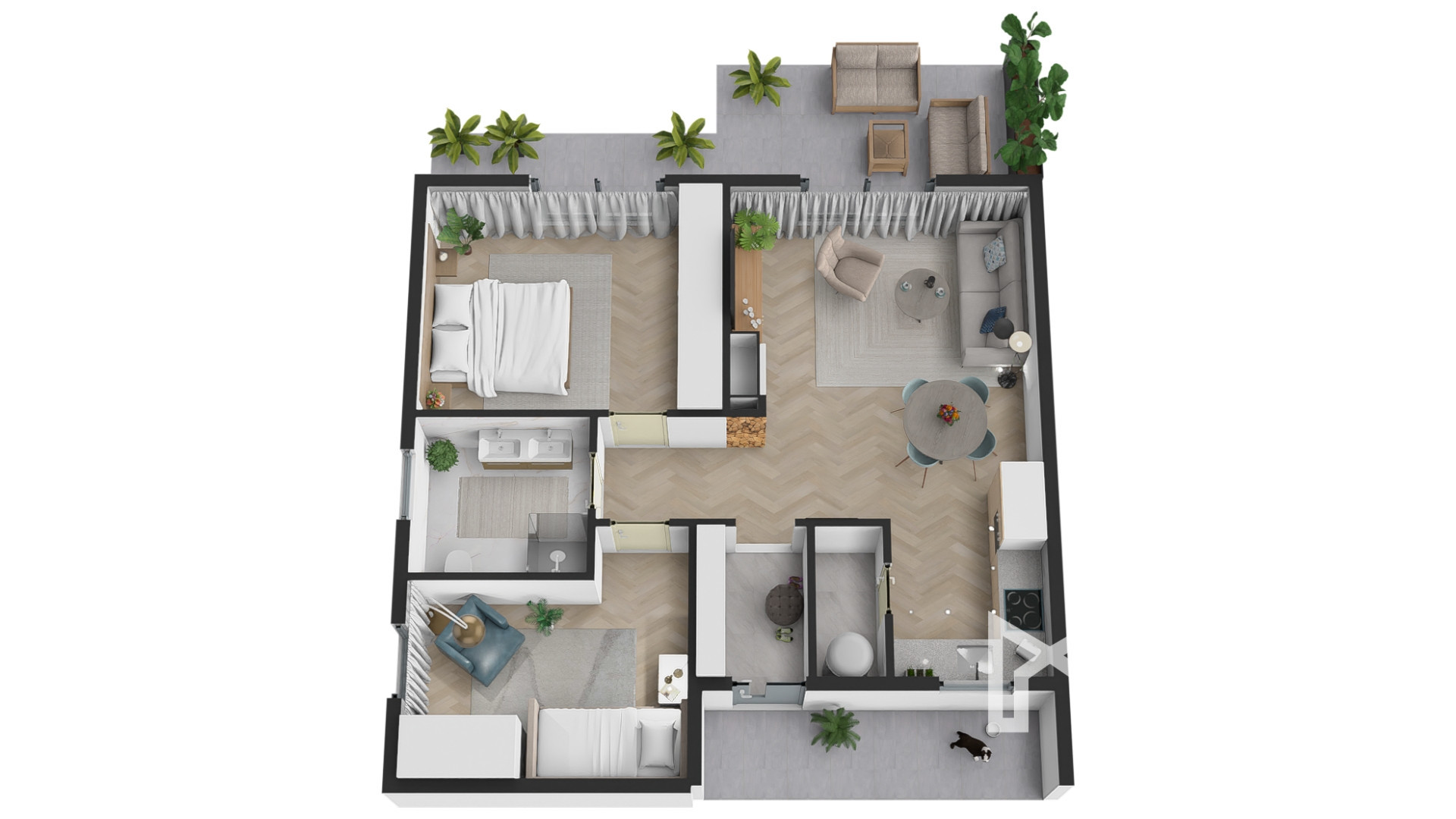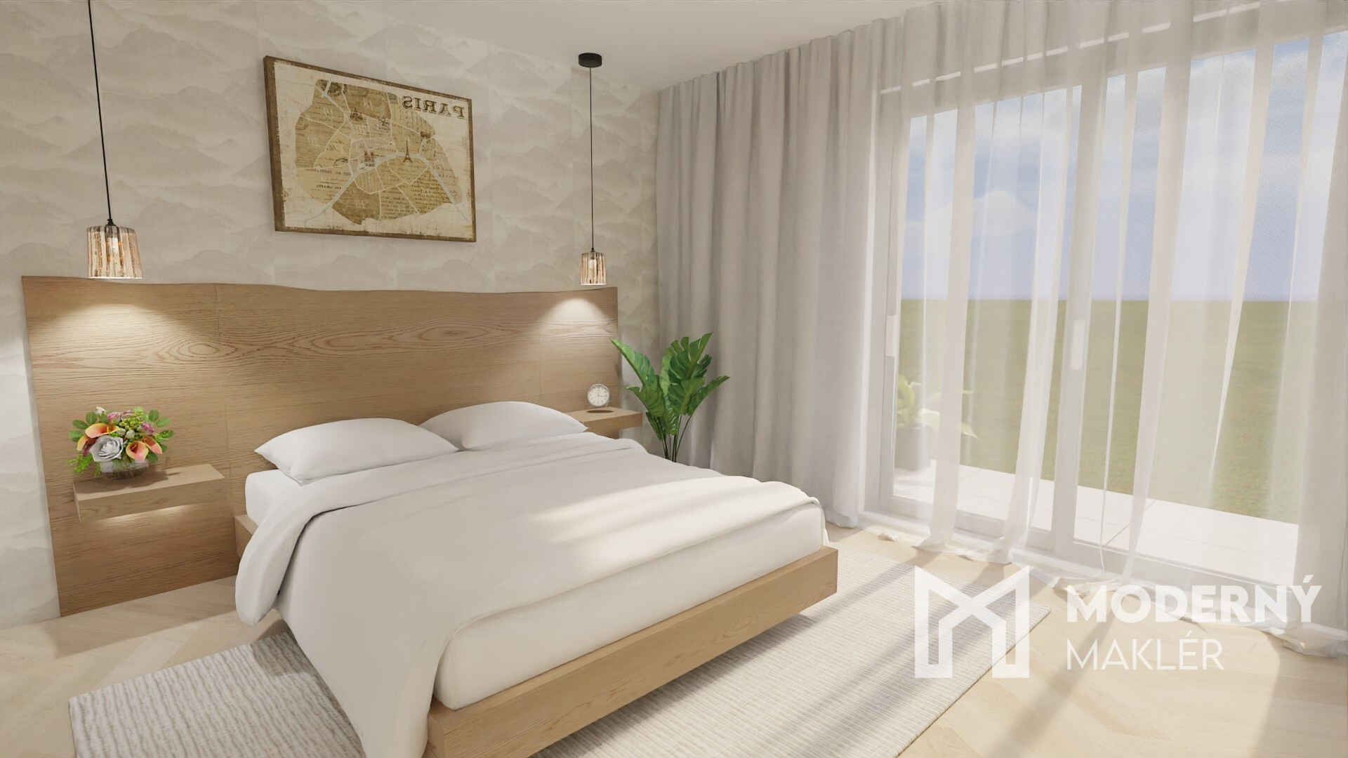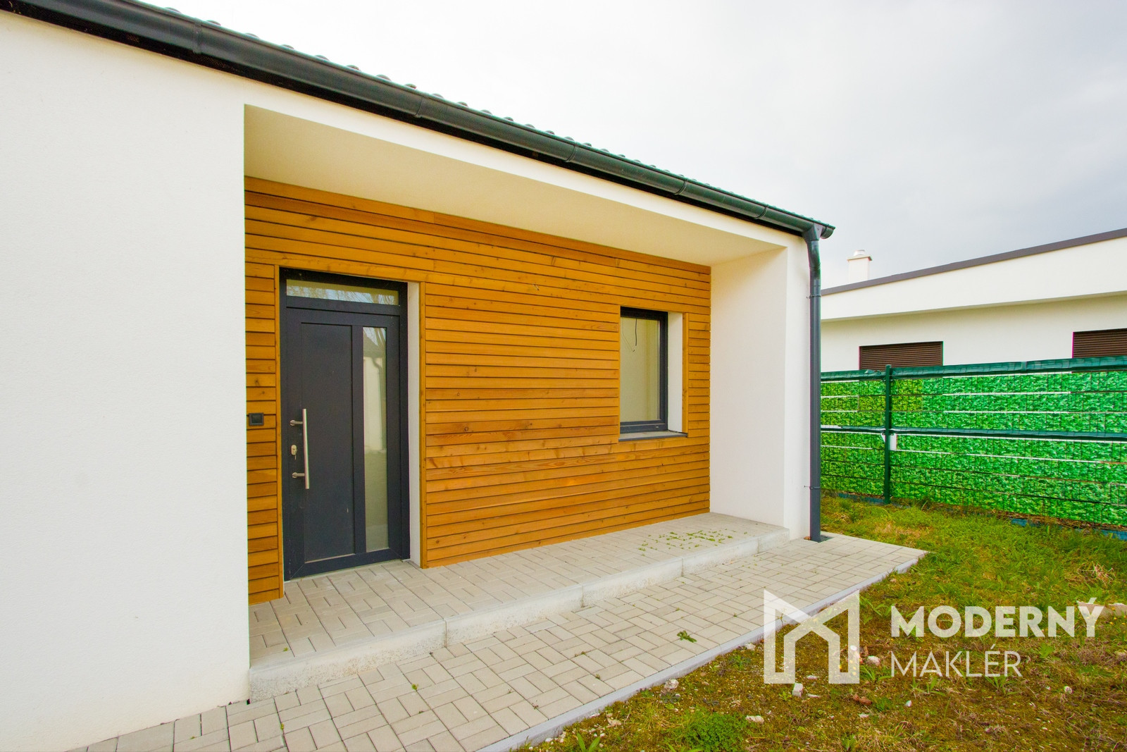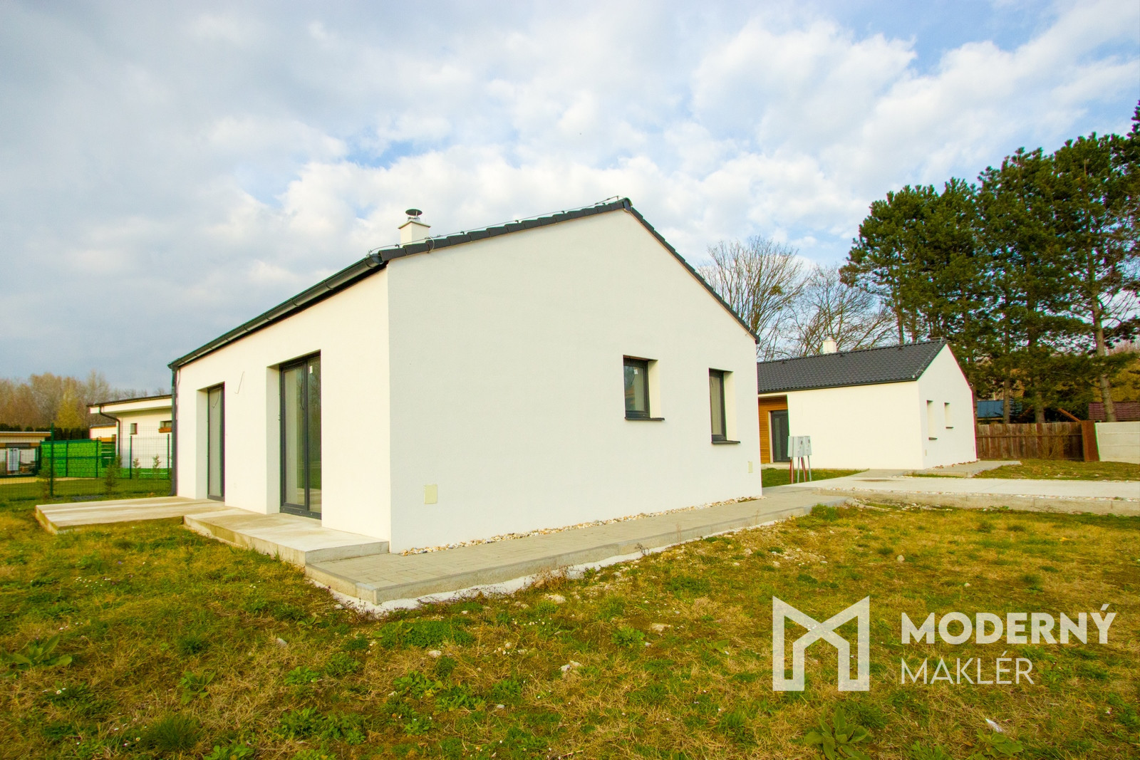 Vstup do domu zabezpečuje centrálna chodba, ktorou prechádzame do obývacej izby spojenej s kuchyňou a s výstupom na terasu, hlavnej spálne s priestorom na vstavanú skriňu, menšej spálne, ktorá je naprojektovaná ako detská izba a kúpeľne. V kuchyni je tiež komora s ohrievačom vody a orientácia terasy je na východ.