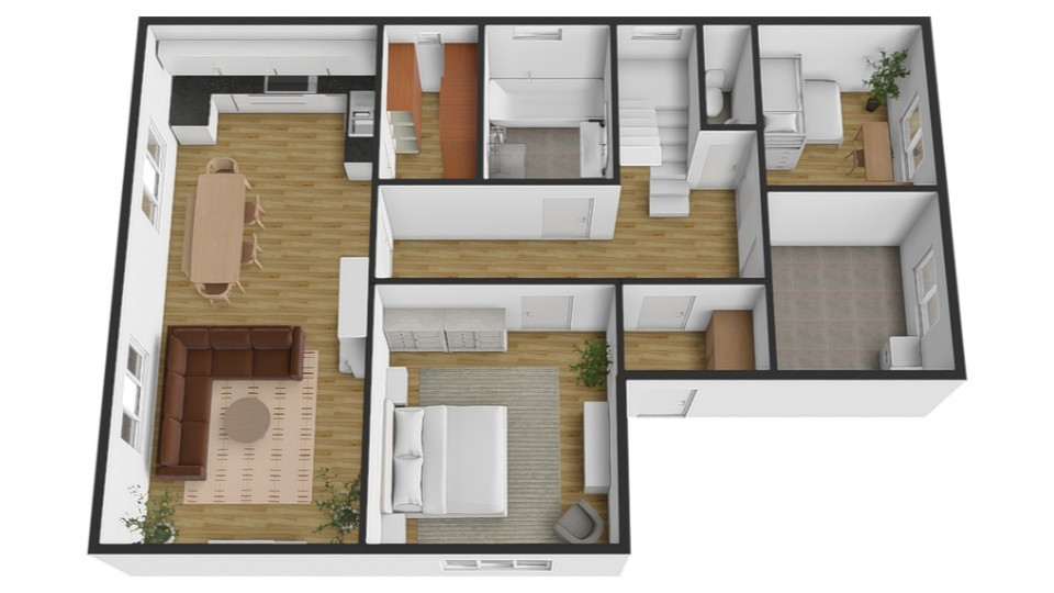Rodinný dom má dve podlažia s premysleným a funkčným usporiadaním priestorov a je čiastočne podpivničený, čo poskytuje ďalší praktický úložný priestor. Na prízemí sa nachádza vstupná predsieň, chodba prepájajúca miestnosti, technická miestnosť, samostatné WC, pracovňa vhodná na homeoffice, kúpeľňa, špajza, spálňa a priestranná obývacia izba prepojená s kuchyňou. Schodisko vedie na poschodie, kde je chodba, druhá kúpeľňa, ďalšia spálňa a otvorený priestor využiteľný ako herňa, pracovňa alebo relaxačná zóna. Dispozícia rozumne oddeľuje denné a nočné zóny.