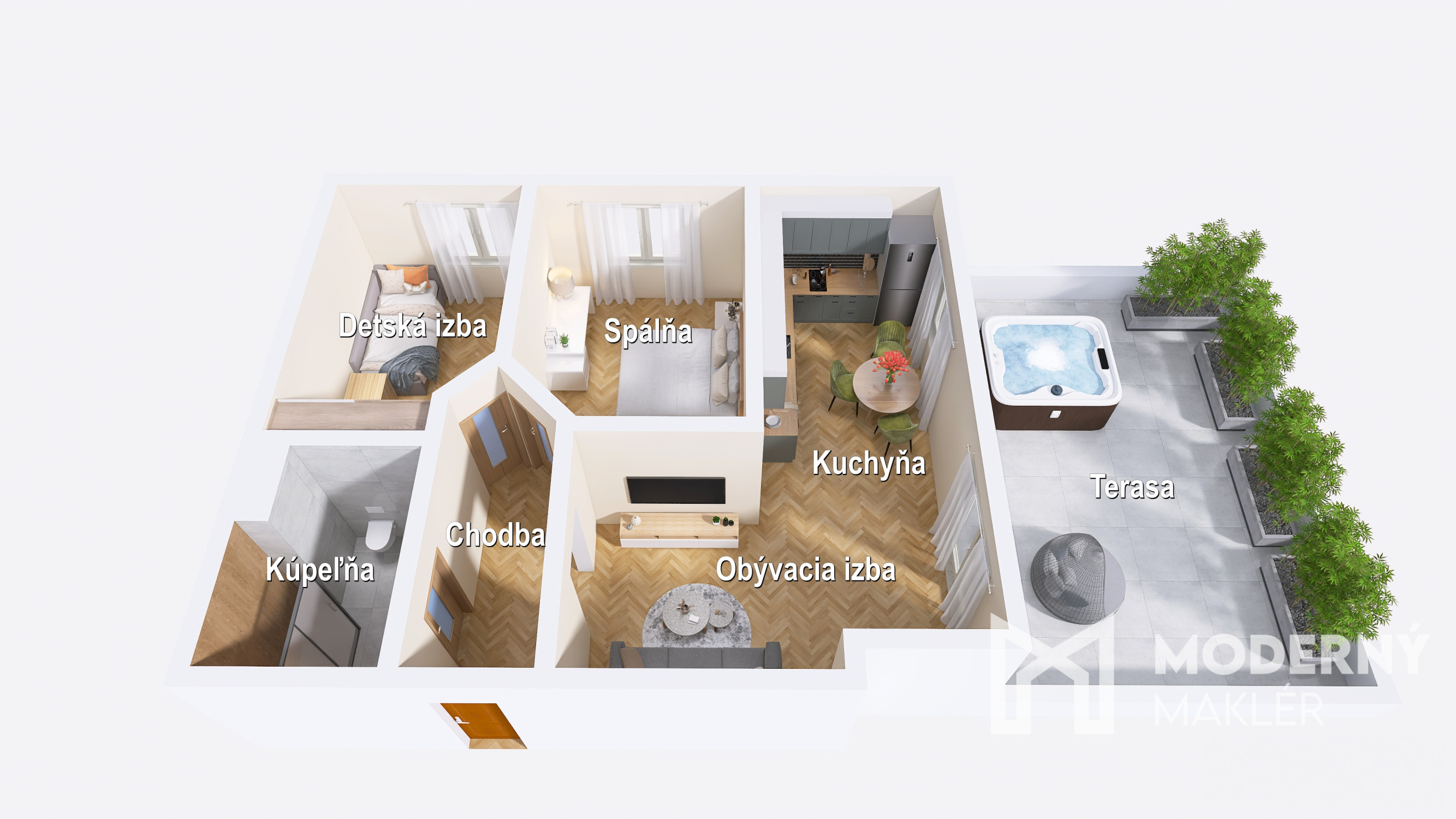 Byt pozostáva zo vstupnej chodby, priestrannej obývacej izby prepojenej s kuchyňou, spálne, detskej izby, kúpeľne spojenej s WC a veľkorysej terasy. Súčasťou bytu je aj murovaná pivnica. Denná časť bytu je otvorená, presvetlená a prirodzene prepojená s terasou, ktorá poskytuje dostatok priestoru na relax, oddych či spoločenské stretnutia. Nočná časť bytu pozostáva zo spálne a detskej izby, ktoré ponúkajú dostatok súkromia a komfortu pre každodenné bývanie. Dispozícia bytu je navrhnutá veľmi prakticky a funkčne, pričom jednotlivé miestnosti na seba prirodzene nadväzujú a vytvárajú harmonický a príjemný priestor na život.