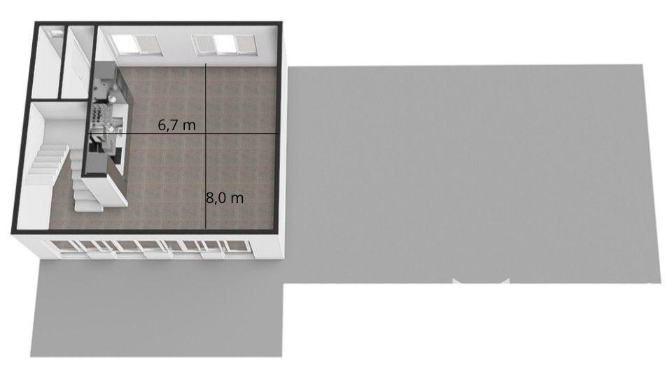 Administratívne prízemie ponúka kompletné zázemie pre každodenný chod firmy. Pri vstupe sa nachádza priestranný showroom (77,95 m²), ktorý môže slúžiť ako reprezentatívna recepcia, prezentačný priestor či kontaktný bod pre klientov. Nadväzuje naň chodba (5,12 m²), technická miestnosť (7,20 m²), sociálne zariadenia (2 × 1,80 m²), predsieň (2,20 m²), šatňa pre zamestnancov (6,76 m²), sprcha (2,08 m²) a upratovacia miestnosť (2,55 m²). Dominantou celého prízemia je masívne schodisko (9,07 m²), ktoré vedie na poschodie.