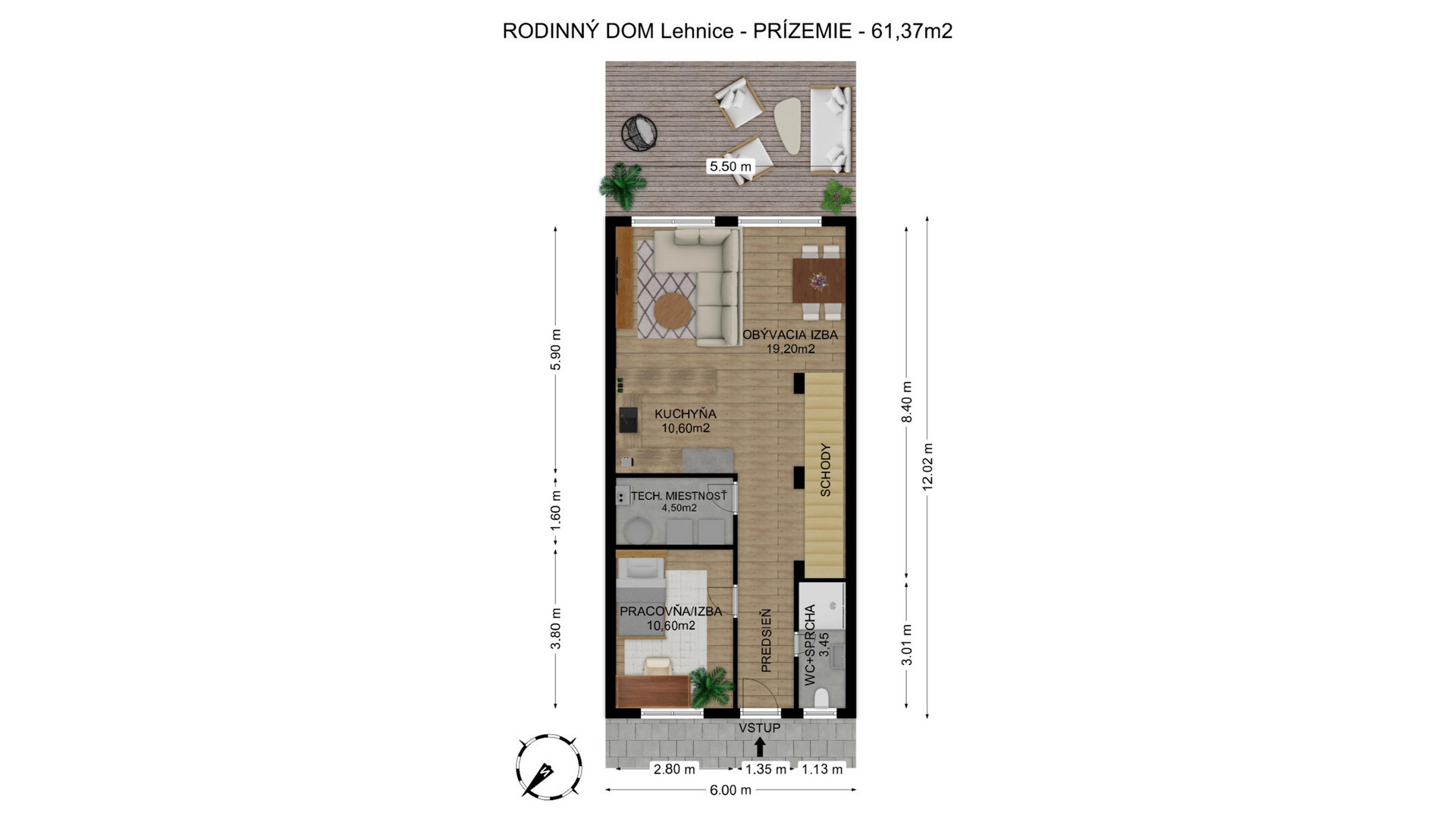 Prízemie vás privíta vstupnou chodbou zo severozápadnej strany, nasleduje samostatná toaleta so sprchovým kútom, hosťovská izba a otvorená denná zóna – priestranná obývačka prepojená s kuchyňou. Z obývacej časti vedie výstup na terasu orientovanú na juhovýchod, čo zaručuje dostatok denného svetla. Súčasťou prízemia je aj technická miestnosť s kotlom a bojlerom. Na poschodí sa nachádza priestranná detská izba, hlavná spálňa s možnosťou dobudovania šatníka a komfortná kúpeľňa vybavená vaňou, sprchovacím kútom a umývadlom.