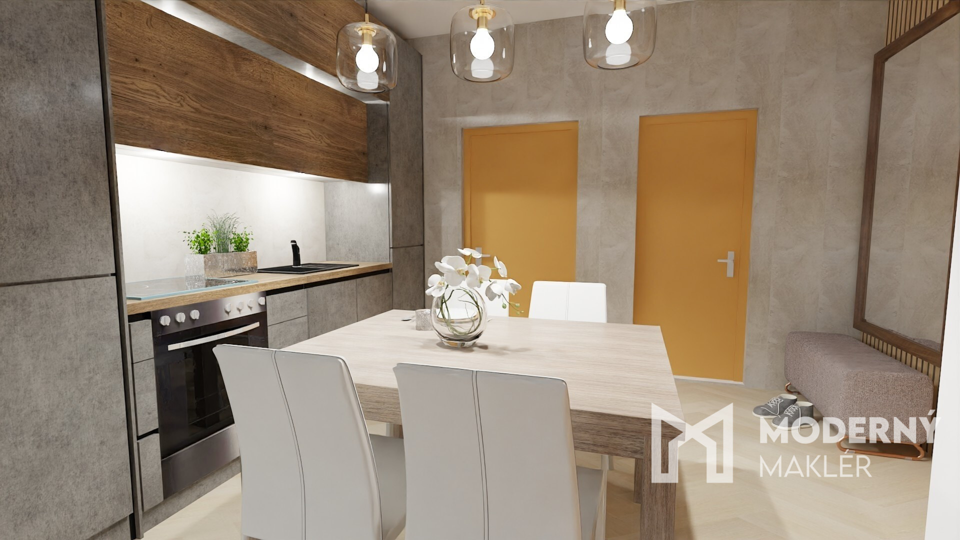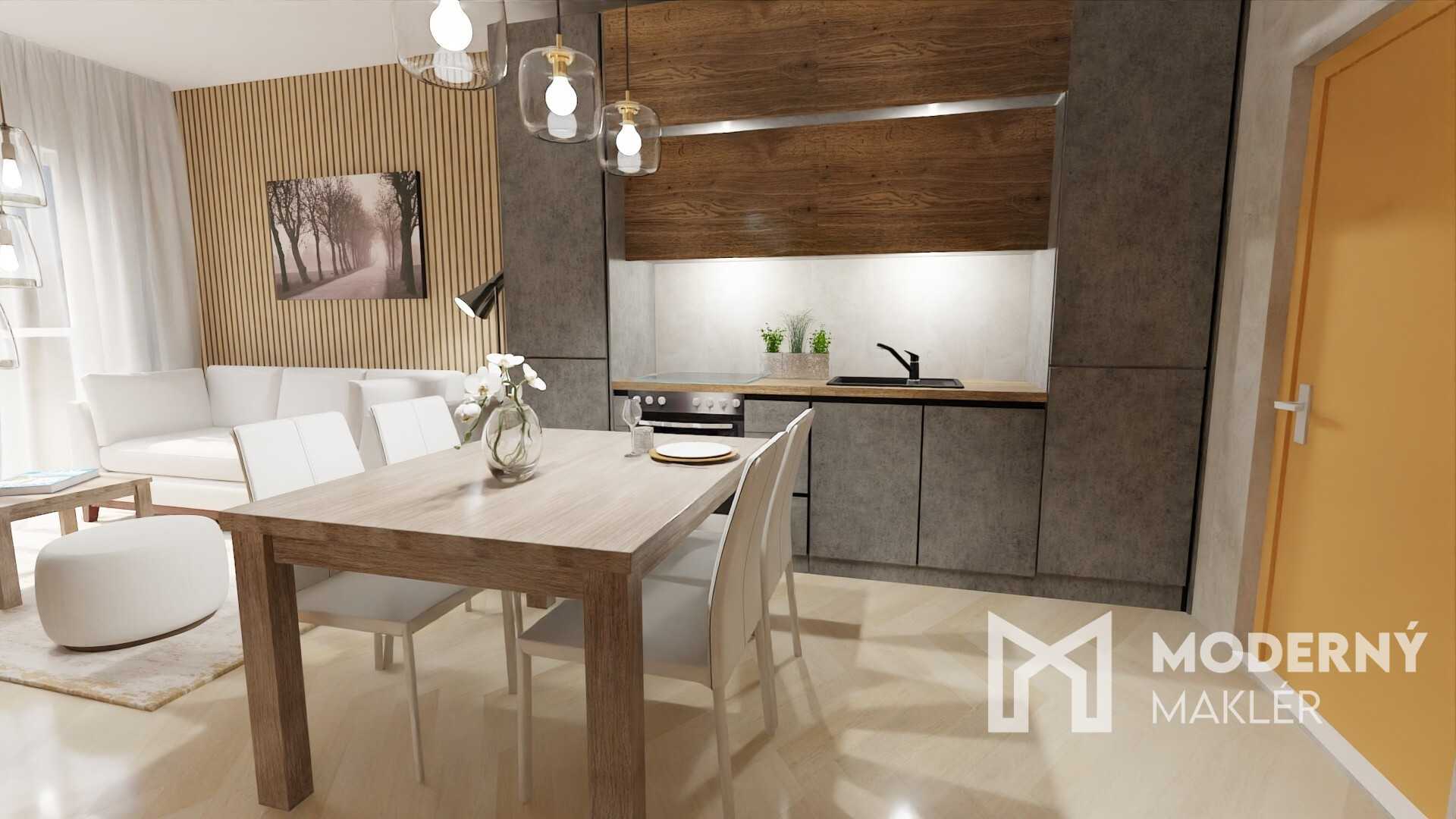 Do bytu vchádzame cez vstupnú predsieň, po pravej strane sa nachádza priestor na kuchyňu, oproti vstupu nájdeme priestrannú obývaciu miestnosť a po ľavej strane sa nachádza kúpeľňa s WC a dve samostatné izby.