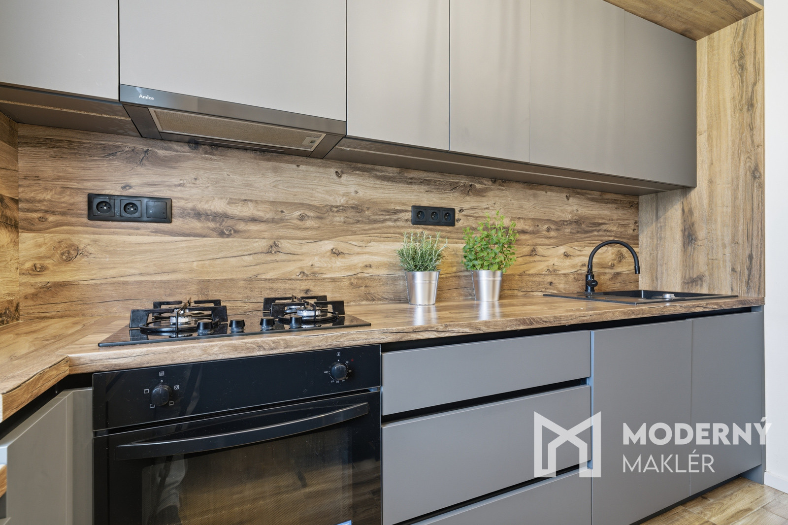 Kuchynská časť obsahuje vstavané spotrebiče (plynová varná doska, elektrická rúra, veľká umývačka riadu, digestor a mikrovlnná rúra). Samostatne stojacu chladničku s mrazničkou dopĺňa dostatočný úložný priestor pre každodenné fungovanie.