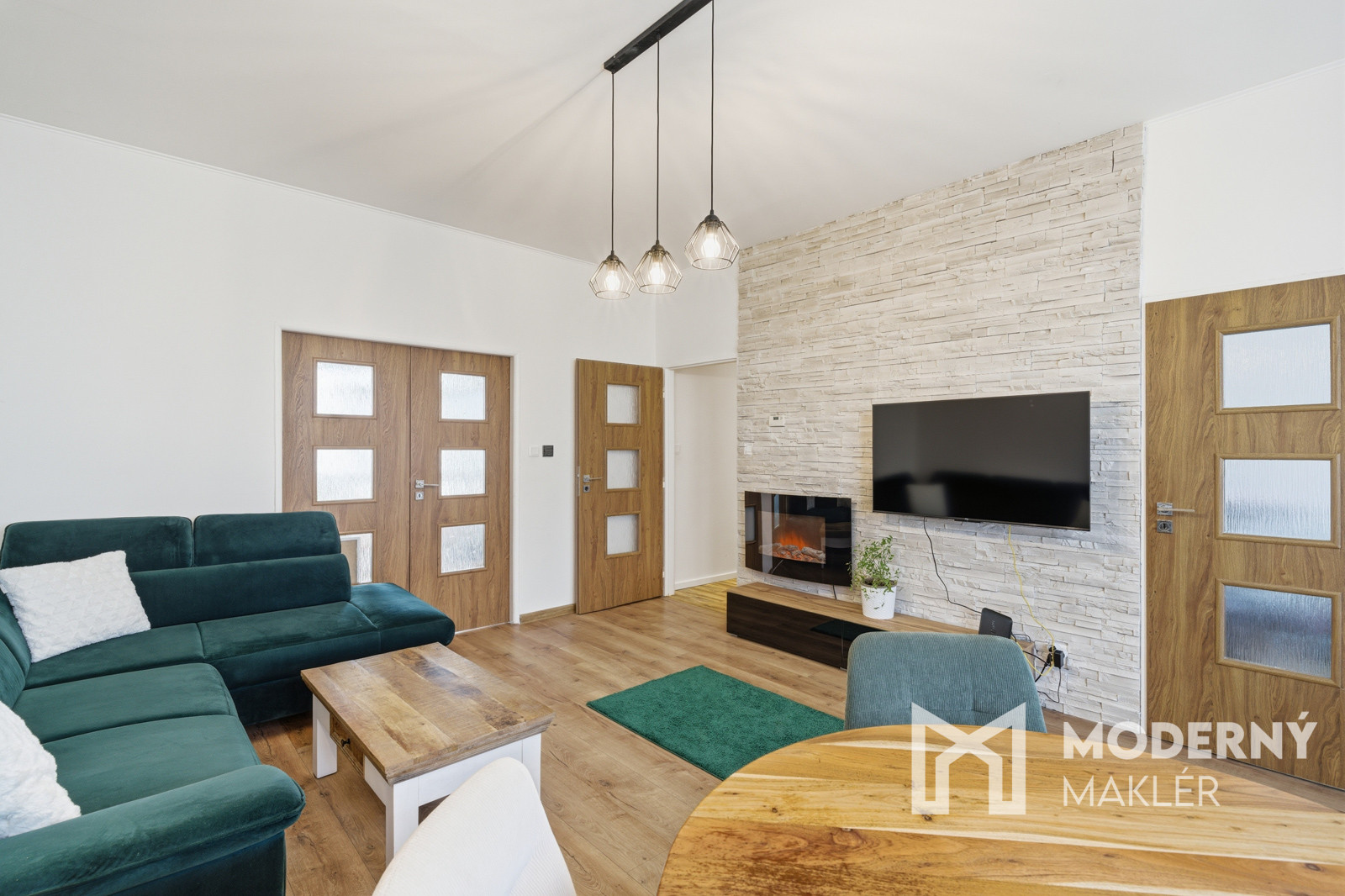 Obývacia izba je zariadená sedacou súpravou, konferenčným stolíkom, dizajnovým jedálenským stolom so stoličkami, knižnicou a TV stolíkom s televízorom. Priestor dopĺňa biokrb, ktorý vytvára príjemný vizuálny aj pocitový komfort.
