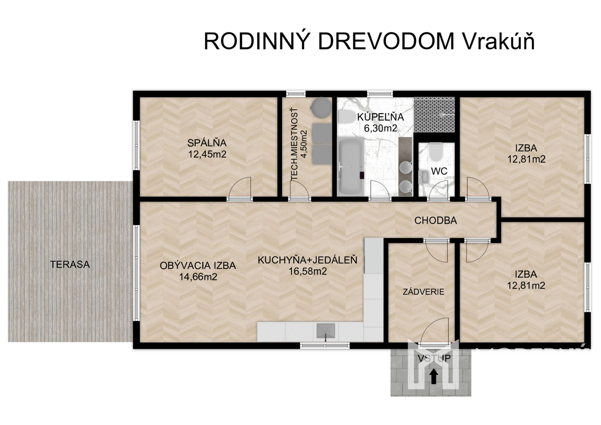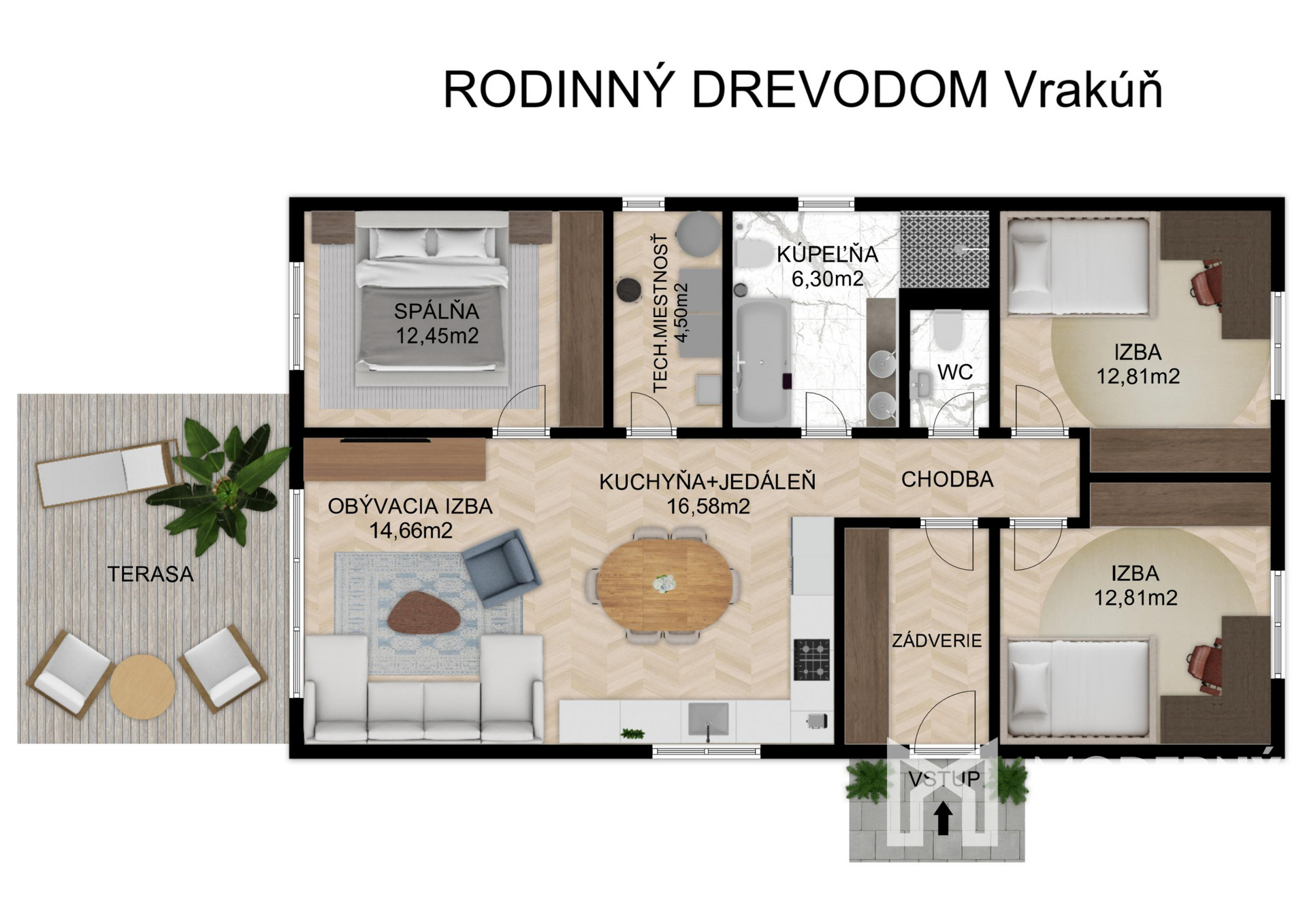 Dom sa skladá z prakticky riešeného prízemného priestoru s bočným vstupom. Po vstupe cez predsieň sa dostanete do centrálnej chodby, z ktorej sa otvára prístup do všetkých miestností. Po pravej strane chodby sa nachádzajú dve detské izby orientované na východ, samostatná toaleta a priestranná kúpeľňa. Chodba ďalej vedie do veľkorysej obývacej izby prepojenej s kuchyňou, ktorá tvorí srdce domova. V dome nájdete tiež praktickú technickú miestnosť a rodičovskú spálňu orientovanú na západ. Z obývacej izby je priamy výstup na západne orientovanú terasu, ideálnu na večerné posedenie a sledovanie západu slnka.