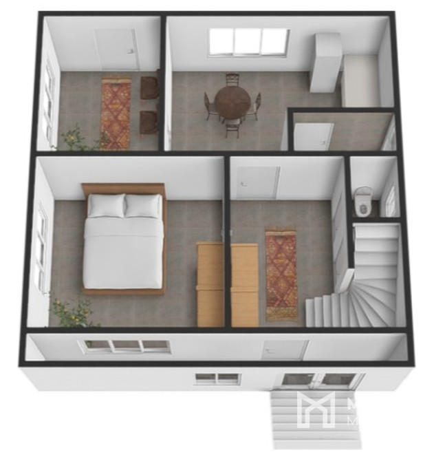 Nehnuteľnosť je dispozične riešená na dve podlažia a pivnicu pod celým domom. Na prízemí sa nachádza vstupná chodba, ktorá vedie do izby, samostatného WC a priestrannej jedálne prepojenej s kuchyňou. Súčasťou kuchyne je praktická špajza. Z chodby zadnej strany domu je tiež prístup na dvor. Pod schodami je šikovne umiestnený vchod do pivnice. Na poschodí nájdete kúpeľňu, chodbu a tri samostatné izby. Vchod domu je orientovaný na severozápad. Dvor je orientovaný na juhovýchod, vďaka čomu je v dome dostatok prirodzeného svetla.