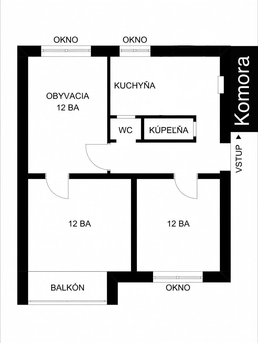 Byt sa skladá z priestrannej vstupnej chodby so vstavnou skriňou, ktorá poskytuje praktické úložné priestory hneď pri vstupe. Z chodby sa nachádza po ľavej strane samostatná miestnosť, ktorá môže slúžiť ako pracovňa alebo detská izba. Ďalej z chodby máte prístup do kúpeľne a samostatného WC, čo zabezpečuje pohodlie pri používaní. Po pravej strane chodby vedie chodbička do kuchyne, ktorá je doplnená o samostatnú murovanú komoru poskytujúcu bohaté skladovacie možnosti. V zadnej časti bytu sa nachádza priestranná obývacia miestnosť orientovaná na juhozápad, ktorá zaisťuje vynikajúce prirodzené osvetlenie počas celého dňa. Hlavná spálňa je tiež situovaná v tejto časti bytu a má priamy východ na balkón s výhľadom do zelene, kde si môžete vychutnať slnečné lúče a relaxačné chvíle. Nehnuteľnosť je veľmi prakticky dispozične riešená a s celkovou výmerou 73 m2 predstavuje ideálne riešenie pre rodinný život.