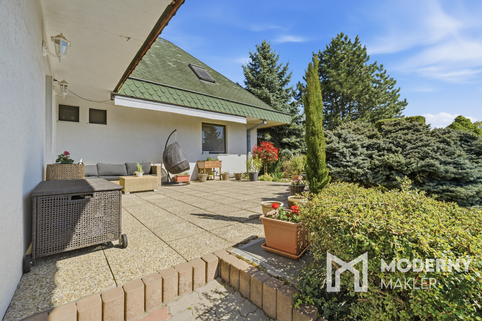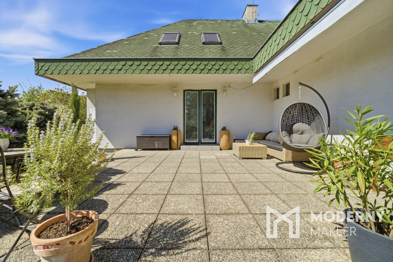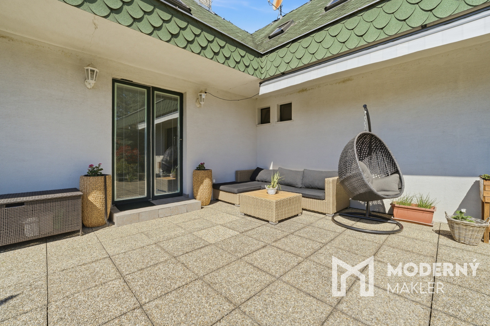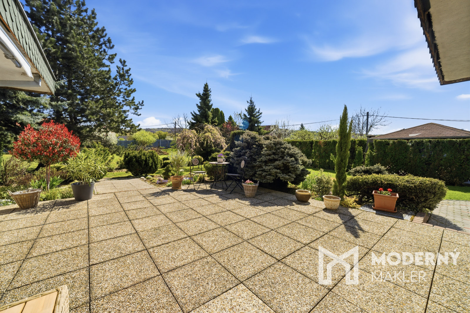 Z obývacej časti je priamy výstup na dolnú terasu s markízou, ktorá prirodzene prepája interiér s exteriérom. Výhľad do udržiavanej záhrady pôsobí upokojujúco a vytvára ideálne miesto na rannú kávu, oddych alebo stretnutia s priateľmi.