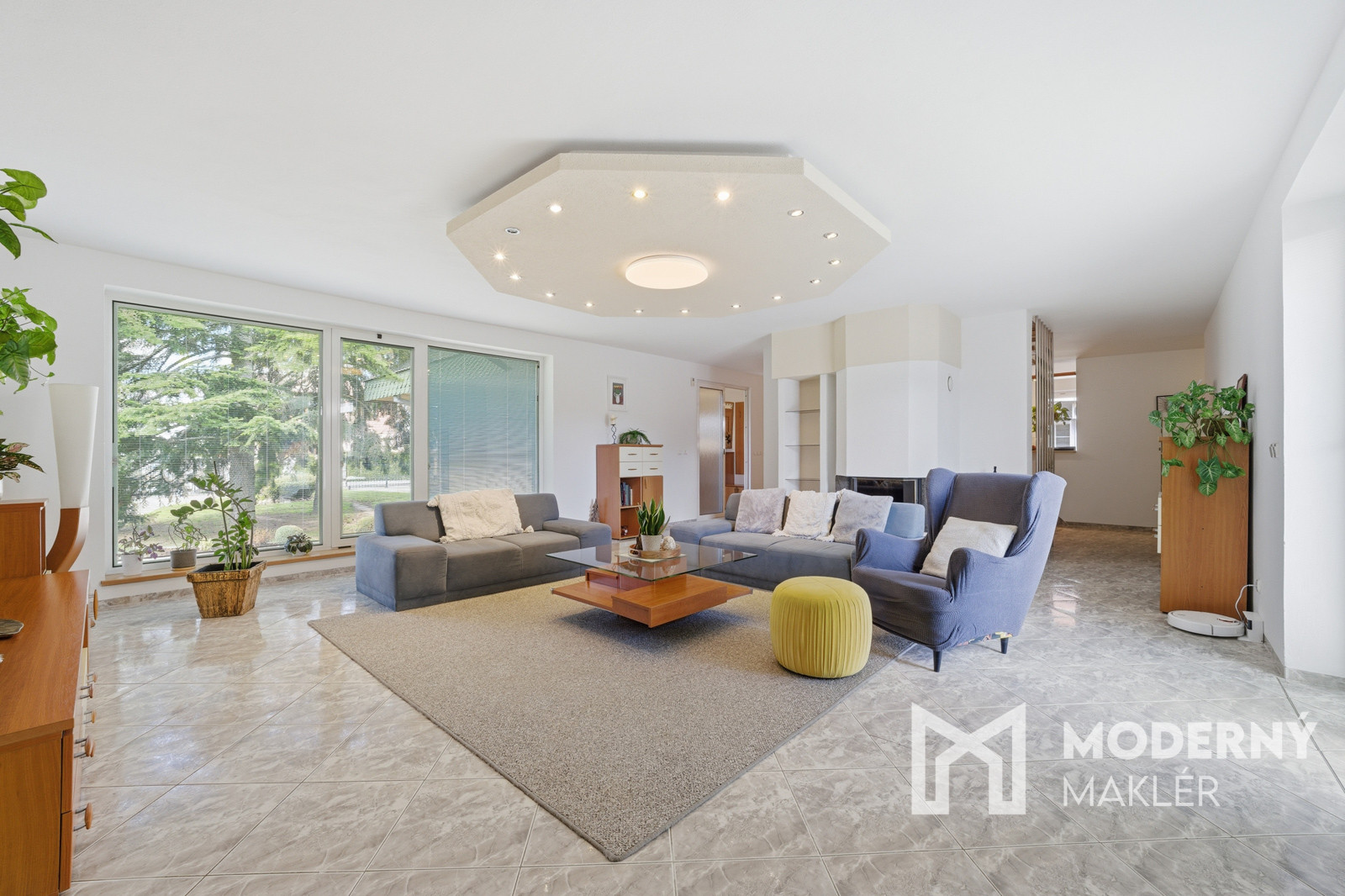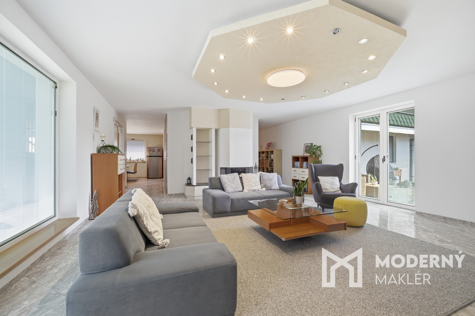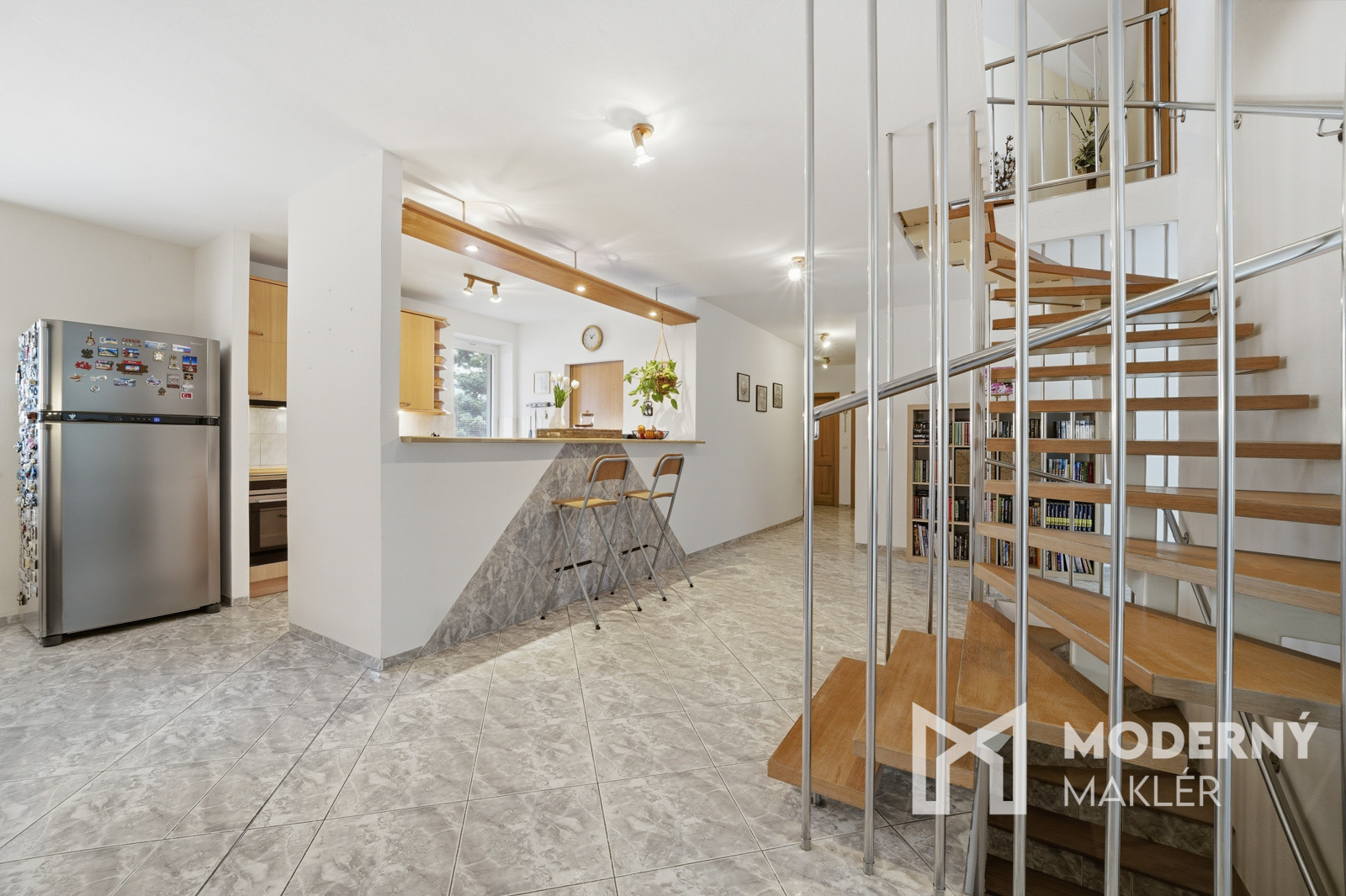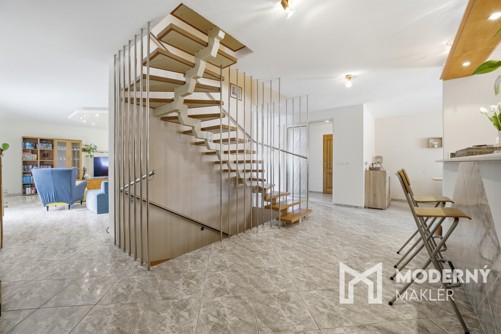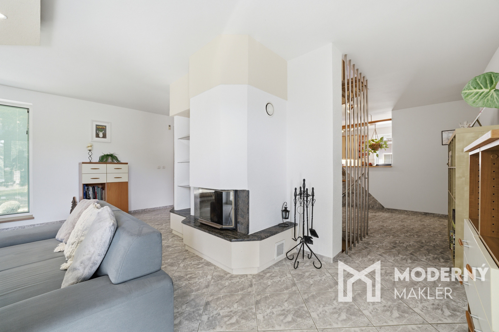 Denná časť domu, do ktorej sa vkročíte suchou nohou priamo z garáže pôsobí otvorene a veľkoryso – obývacia izba plynulo nadväzuje na kuchyňu a jedáleň, čím vzniká centrálny priestor pre rodinný život. Dominantou je krb, ktorý vytvára príjemnú atmosféru najmä počas chladnejších dní. Z kuchyne sa zároveň dostaneme do šikovne schovanej práčovne a praktickej špajze, ktoré zvyšujú komfort každodenného fungovania domácnosti.