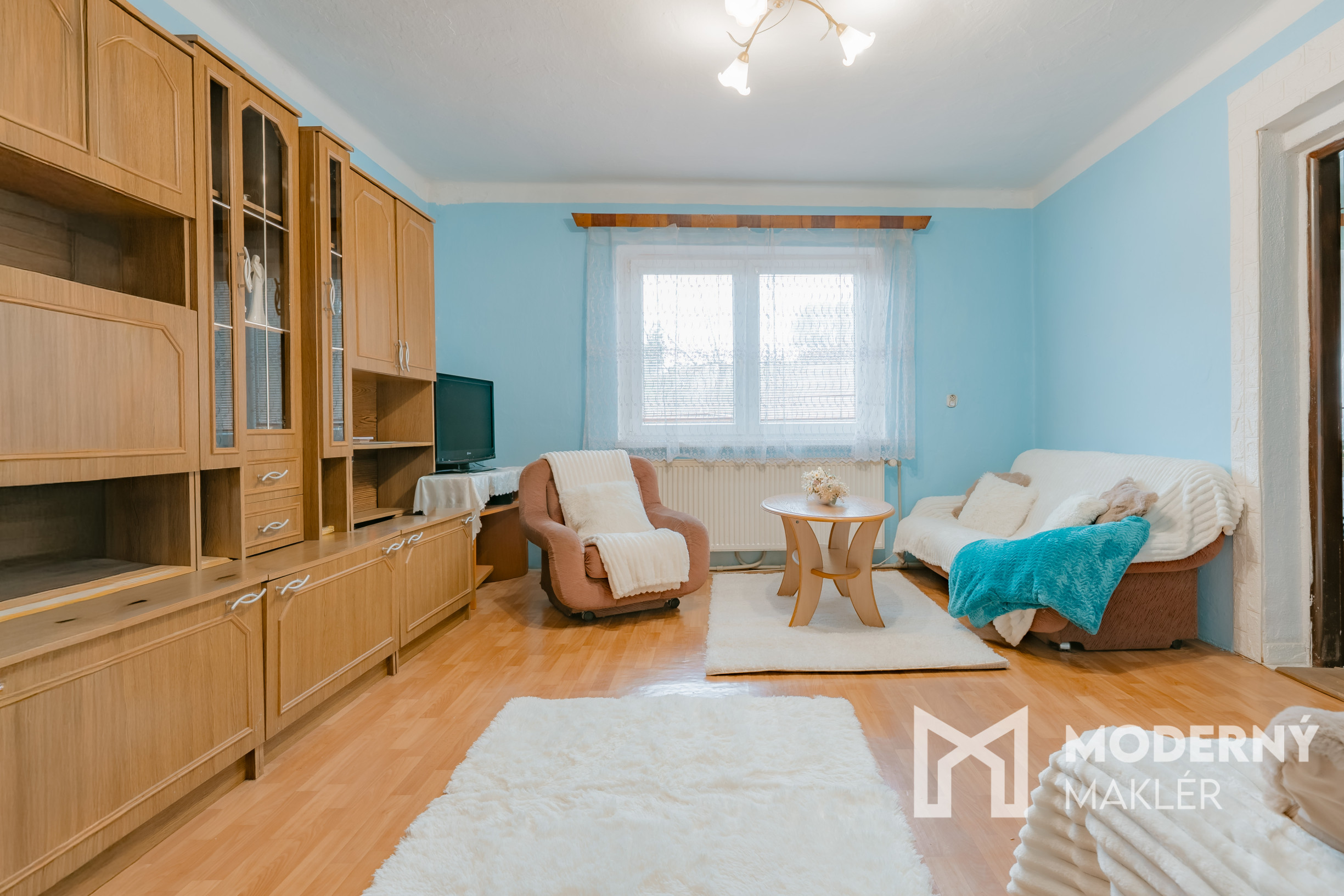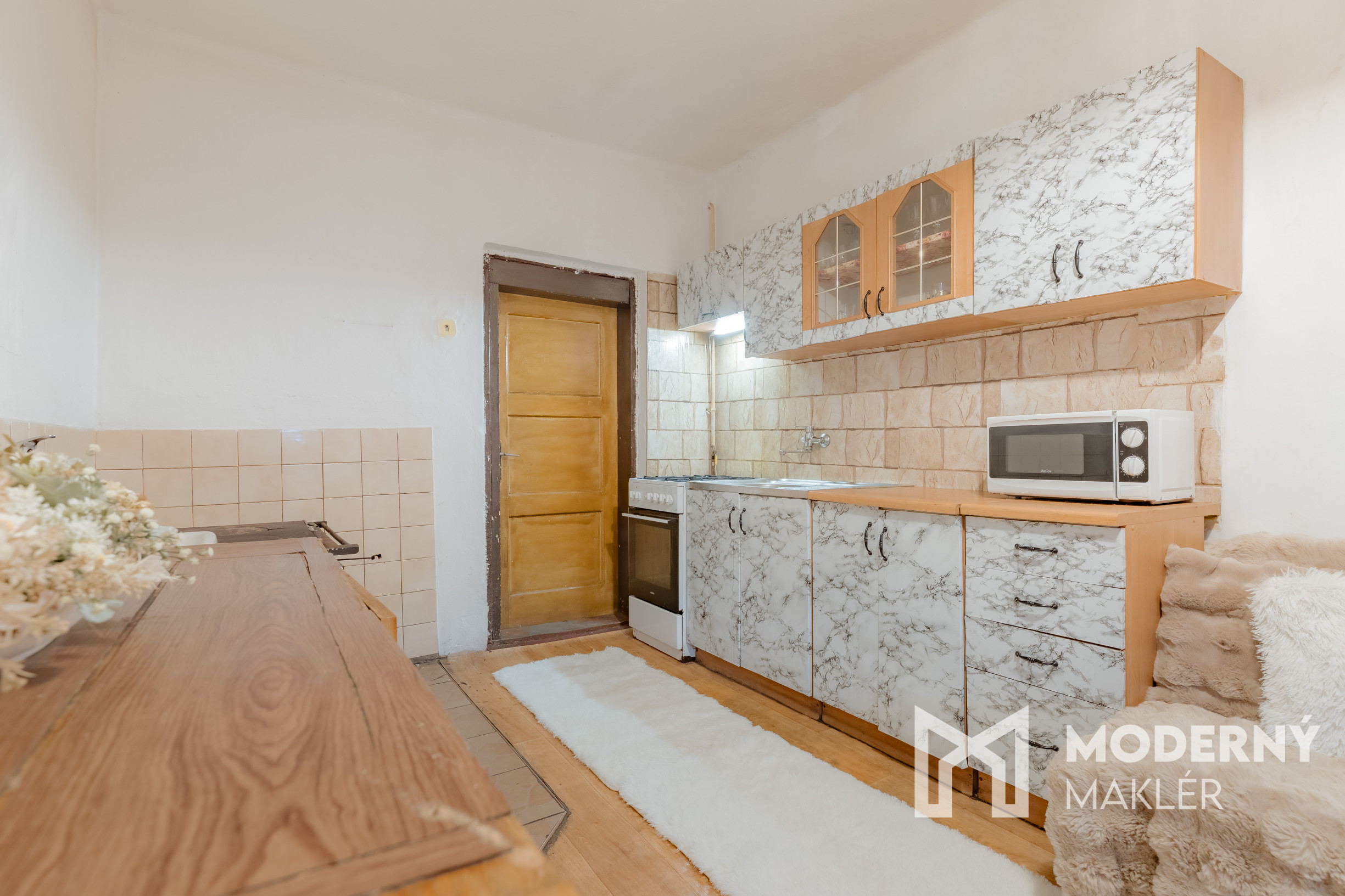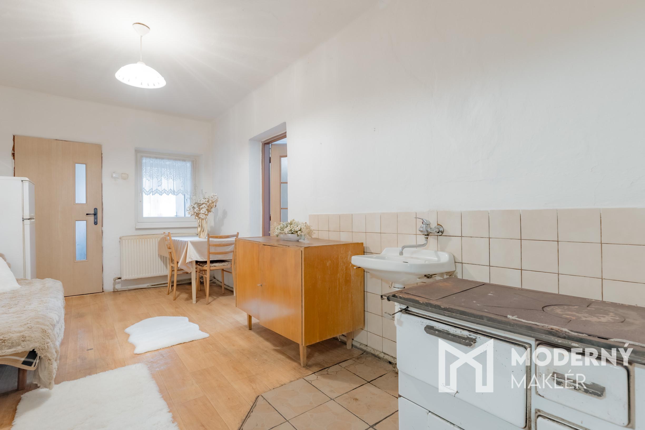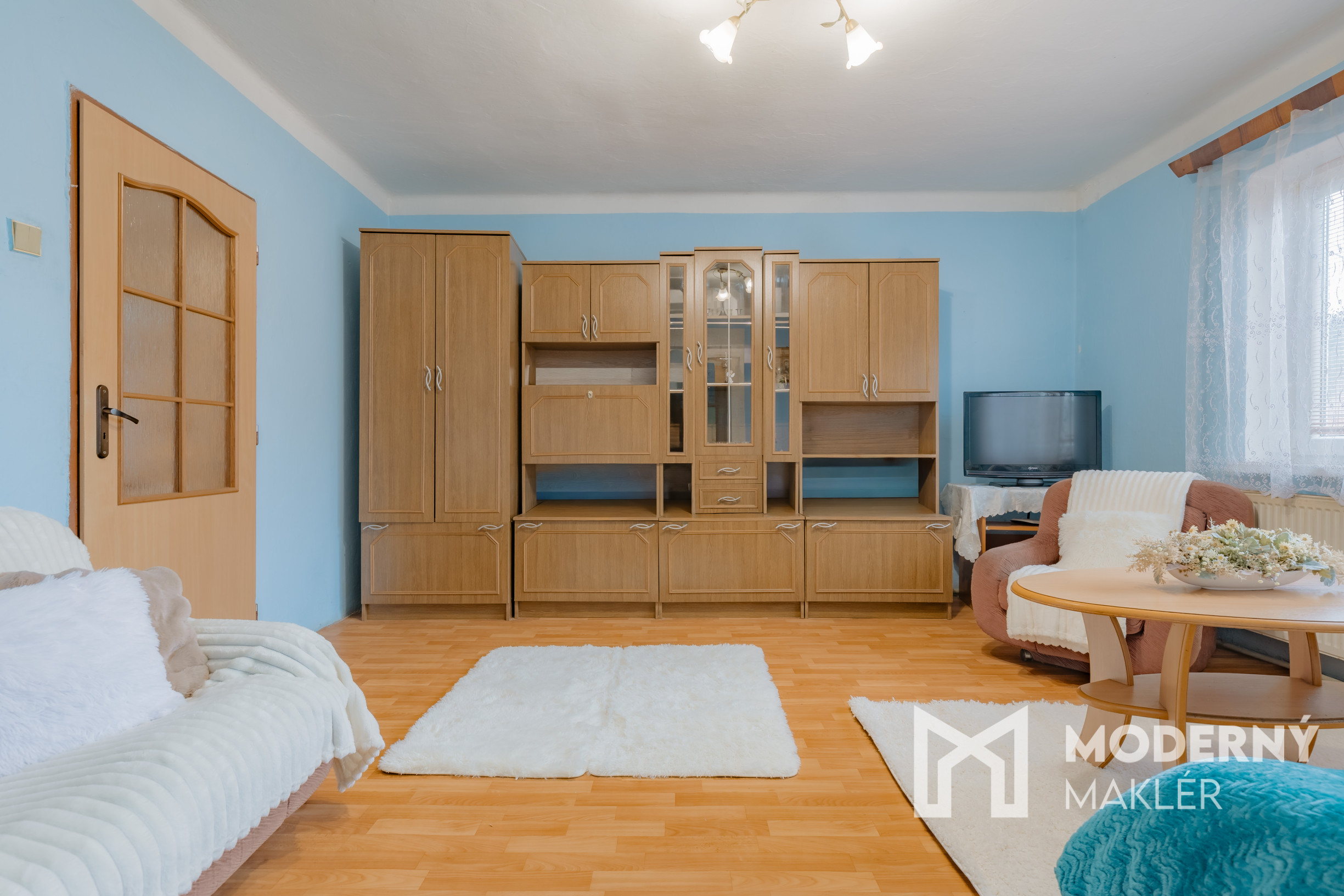 Nehnuteľnosť sa predáva čiastočne zariadená. Kuchyňa je vybavená kuchynskou linkou a jedálenským stolom so stoličkami. O vykurovanie sa starajú kachle na pevné palivo, rovnako ako nový plynový kotol v kúpeľni. Obývacia izba ponúka obývaciu stenu, gauč a konferenčný stolík, čím vytvára príjemný priestor na oddych. V spálni nájdete posteľ a skriňu, ktoré poskytujú základný komfort pre bývanie.