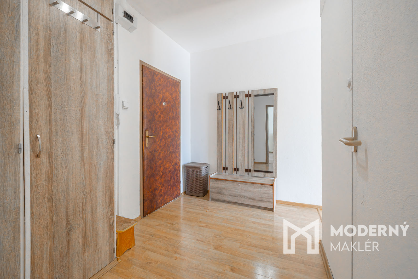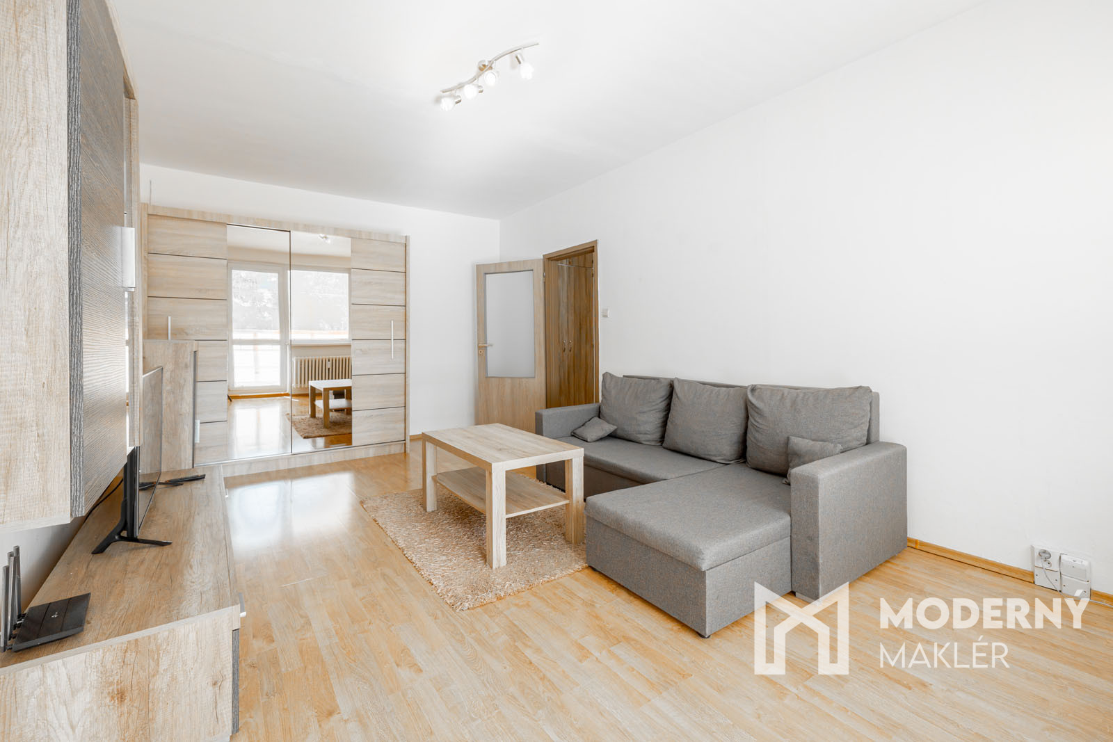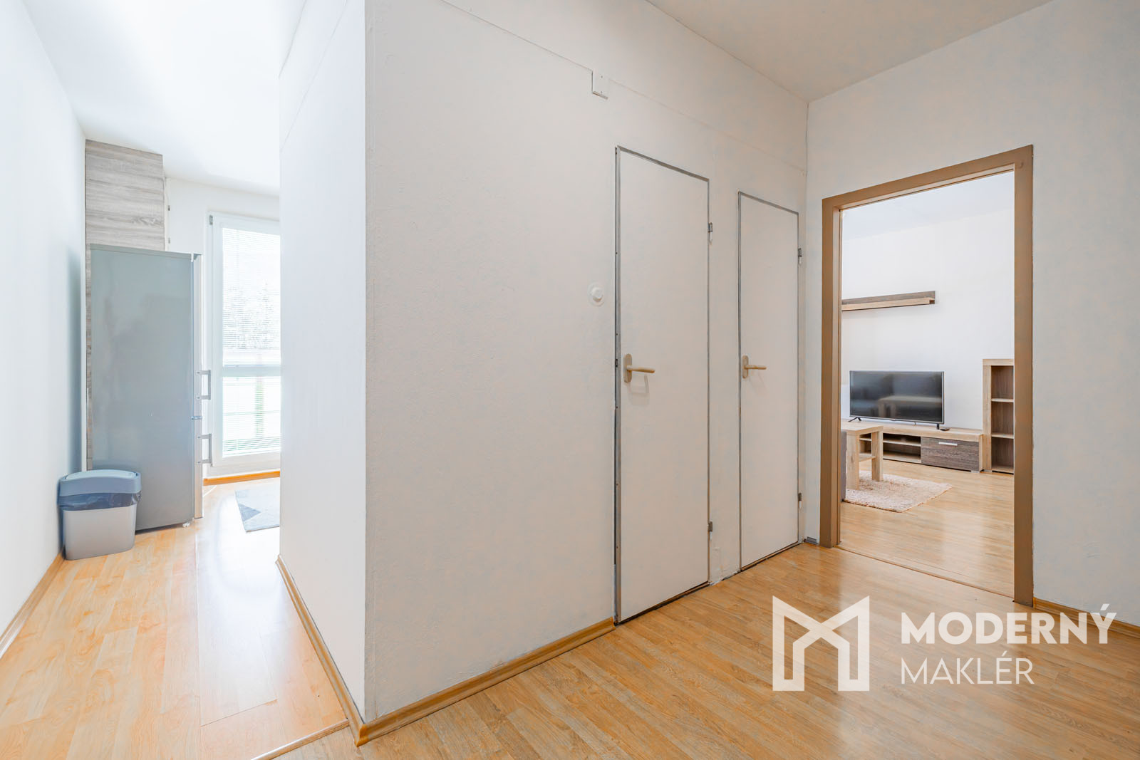 Do bytu vchádzame cez vstupnú predsieň, po ľavej strane prechádzame chodbou do kuchyne, oproti vstupu nájdeme kúpeľňu s vaňou a WC. Po pravej strane prechádzame do rozmernej obývačky.