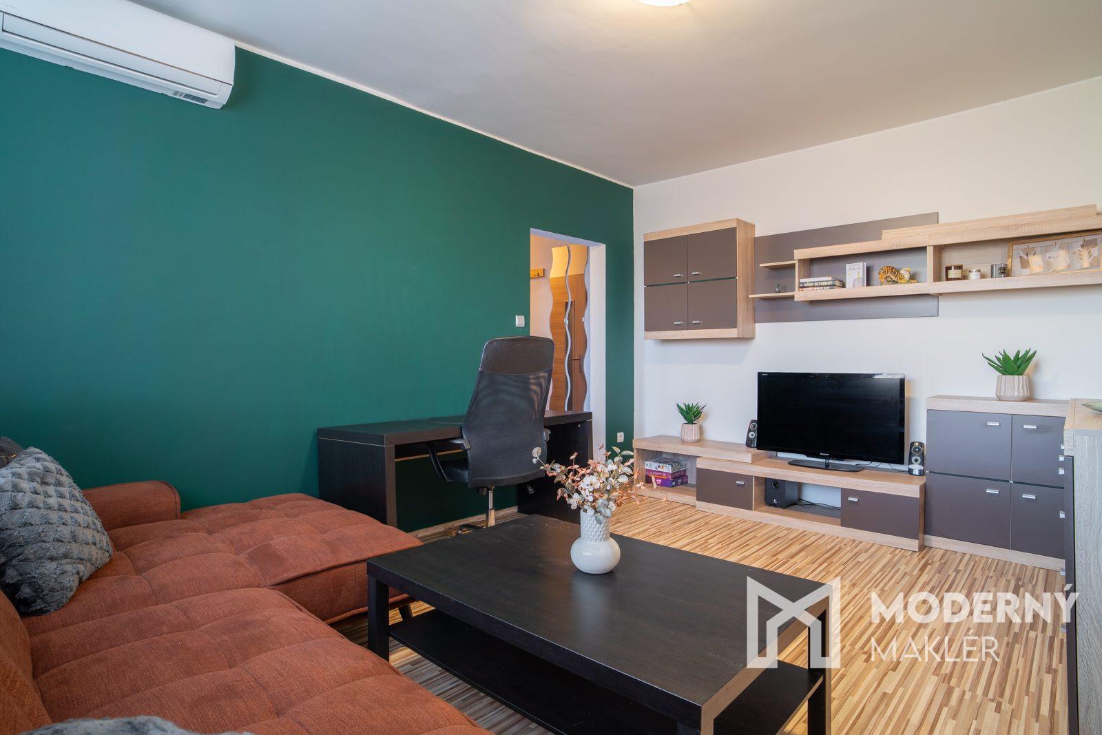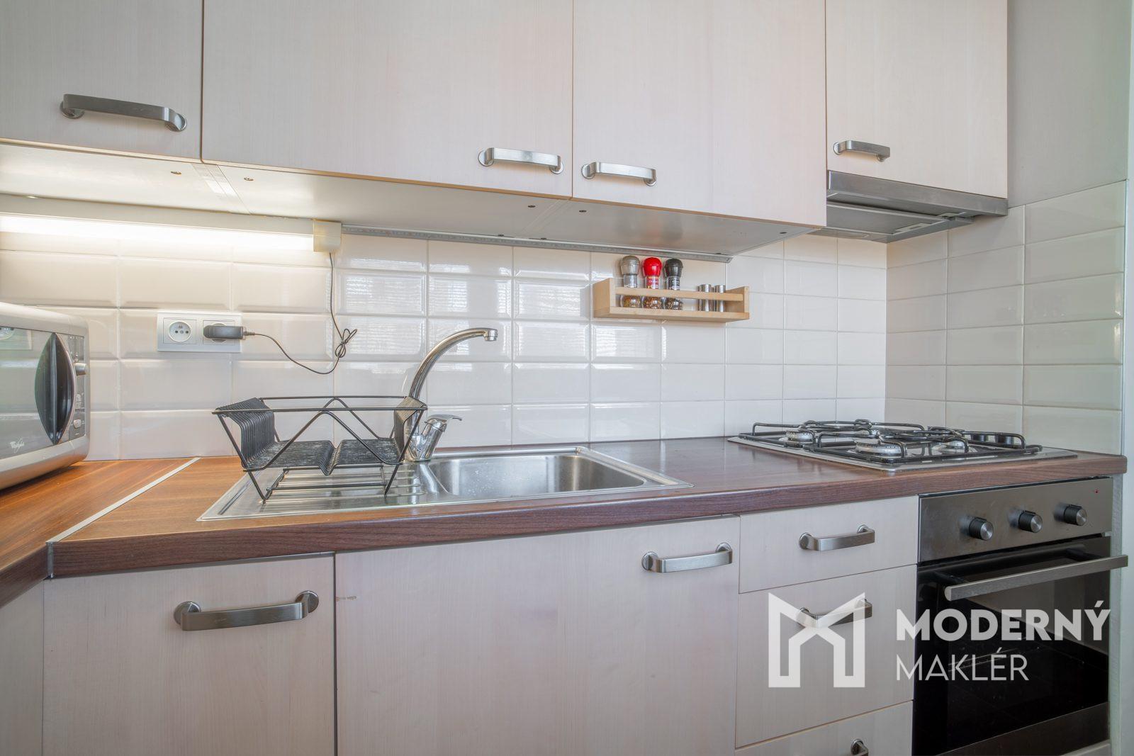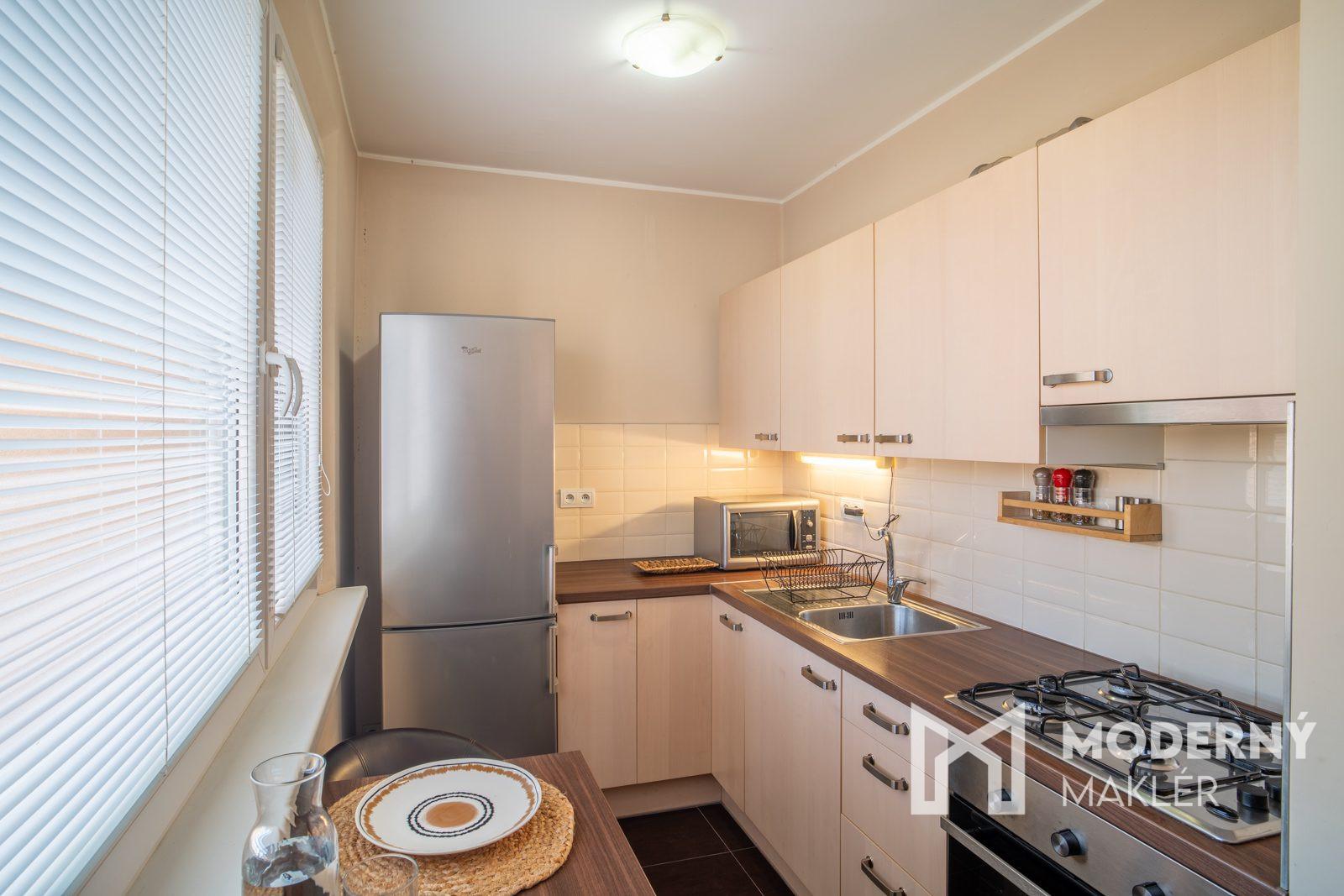 Byt je kompletne zariadený a prakticky dispozične riešený. Vstupná chodba ponúka dostatok úložného priestoru v podobe vstavanej skrine, doplnenej zrkadlom a botníkom. Z chodby je prístup do kúpeľne s vaňou, práčkou a toaletou. Samostatná kuchyňa je vybavená kuchynskou linkou so zabudovanými spotrebičmi (plynový sporák, elektrická rúra, chladnička s mrazničkou, mikrovlnná rúra), jedálenským kútom so stolom a stoličkami. Obývacia izba ponúka príjemný priestor na oddych aj prácu – nachádza sa tu obývacia stena, rozkladacia sedacia súprava, konferenčný stolík, pracovný kút, TV a klimatizácia. Spálňa je zariadená manželskou posteľou, vstavanou skriňou, komodou a TV. Byt je vybavený plastovými oknami, bezpečnostnými dverami a disponuje pripojením na internet (WiFi) a káblovú televíziu.